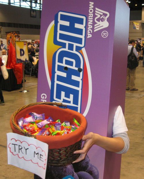 Dieters of the world, beware one of your several thousand sworn enemies: free samples of addictive Japanese fruit candy! Do you dare negotiate with their giant-sized living spokesmodel?