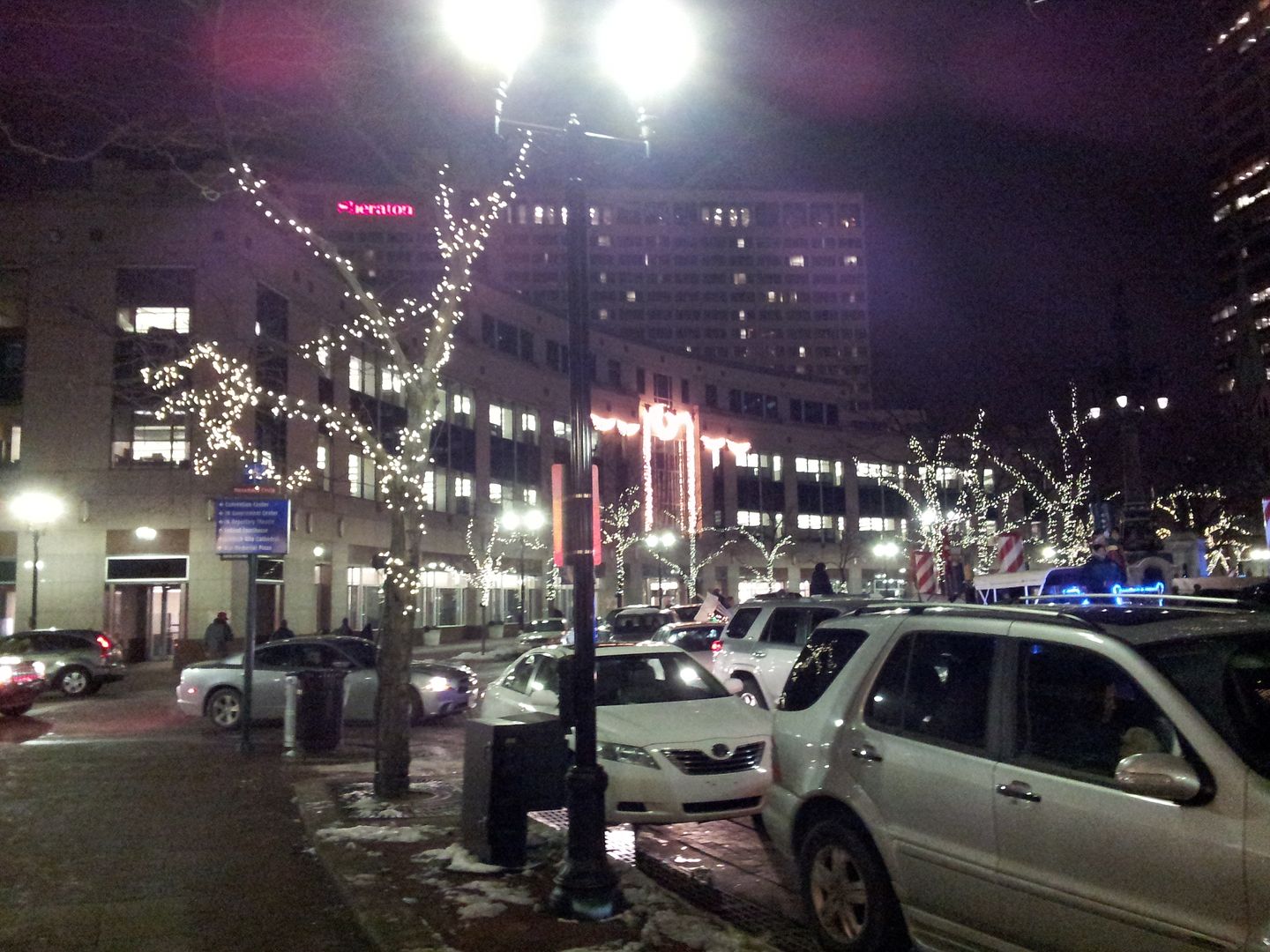 Outdoor tree lights viewed from above along North Illinois Street. At the time this was taken, temperatures were in the teens, I couldn’t manage the phone with my gloves on, and my hands were begging for amputation. After three tries, this was as good as it was going to get.