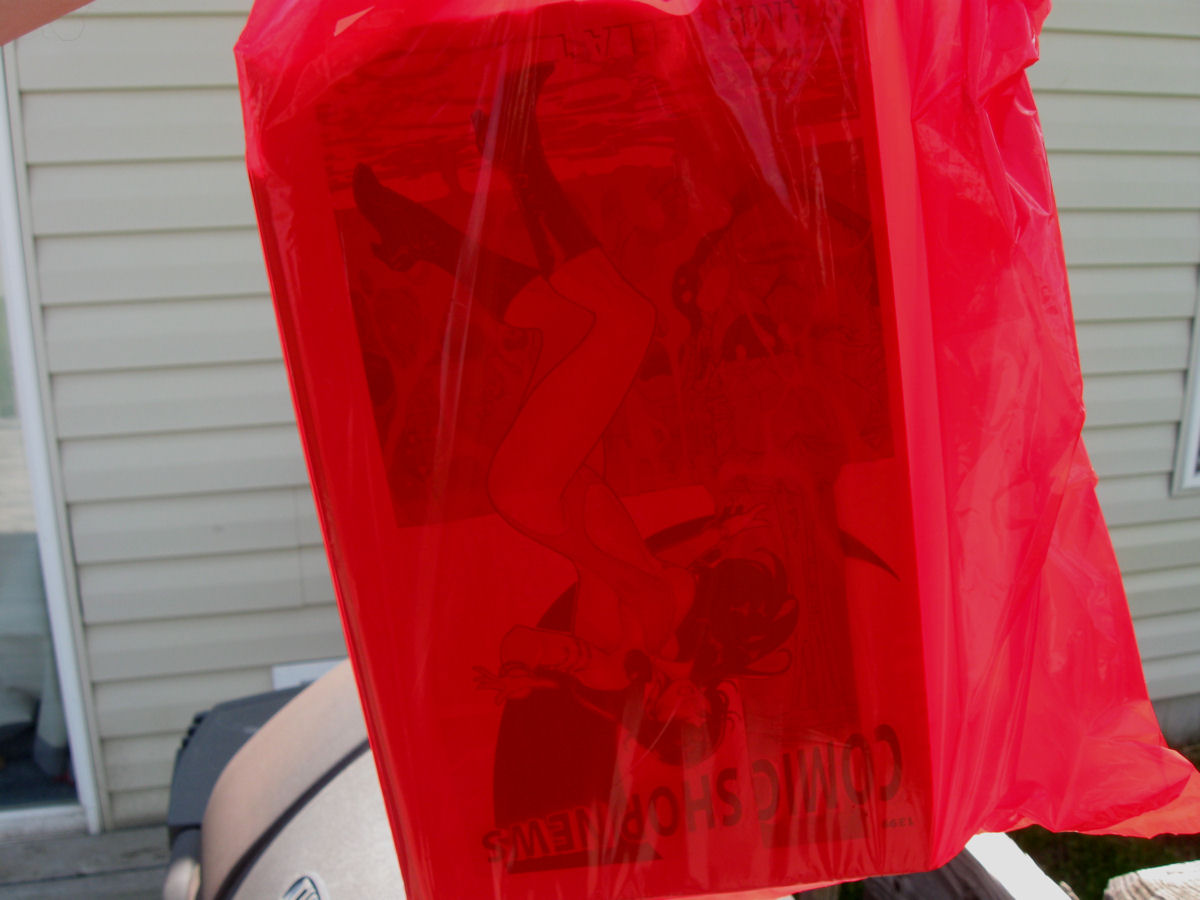 This isn’t the first time I’ve wound up with baggage from the comic shop that could easily invite the glaring wrath of the mothers and grandmothers who outnumber me at work. Last year the shop was using bags provided by Fox promoting their new TV series The Following. I can’t find a photo of this bag online and perhaps that’s for the best, but the image on both sides was the show’s logo next to a photo of a nude woman with a knife, her R-rated parts nestled behind her other parts. That one was impossible to overlook. When presented with one of those, I took the comics out of the bag, turned the bag inside-out, placed the comics inside the now-opaque reverse-bag, went on my merry way, and never watched the show. Problem solved.