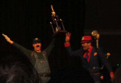 As for the others: third place, amateur division, was a pair of brothers. Behold: Mario from Super Mario Sunshine! His working Turbo Nozzle squirts water.