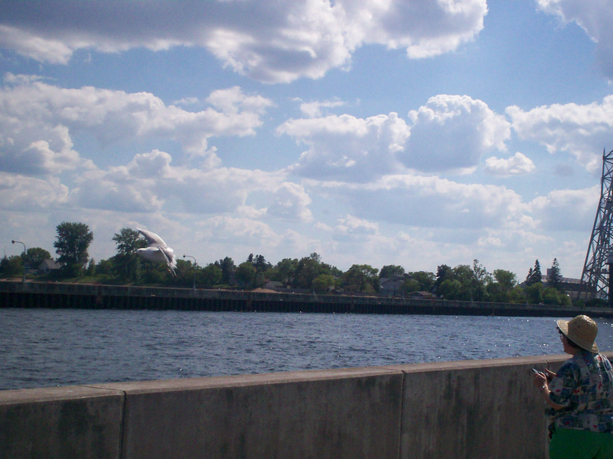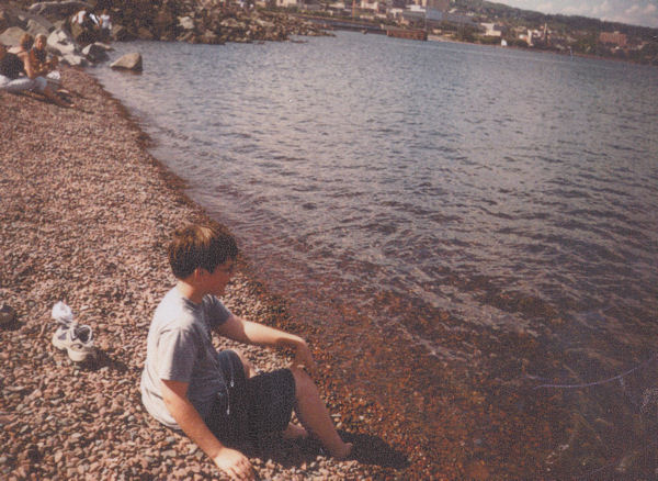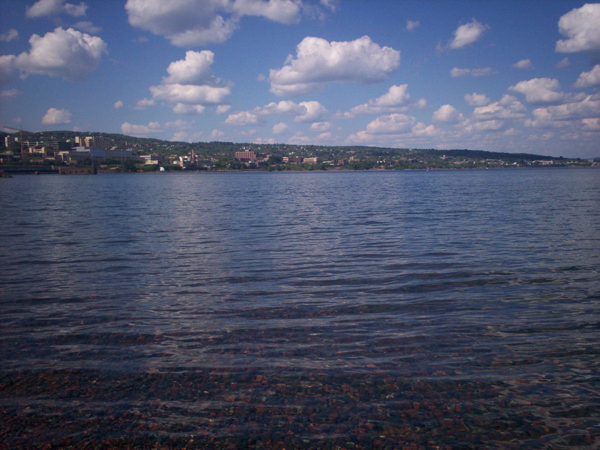 Once you climb down a barrier of enormous piled rocks, an uncomfortable gravel bed grants all-access to the lake. Whereas Lake Erie and Lake Ontario were freezing cold when we saw them in 2004, and whereas Lake Michigan threatens all comers with promises of riptides and killjoy lifeguards, Lake Superior — by contrast the largest, and the northernmost of the Great Lakes we’ve seen — was the warmest, the most scenic, and the most inviting.
