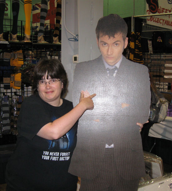 I suppose you could also plop a fez on the head of this Tenth Doctor standee, but that would make no sense and muss his precious cardboard hair.