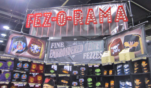 Fez-O-Rama, a west-coast company that sells exactly what you see here, were also at Gen Con the week before. Sure, you could wear a plain red fez like the Eleventh Doctor did a couple of times, or you could work with Fez-O-Rama and find something with style.