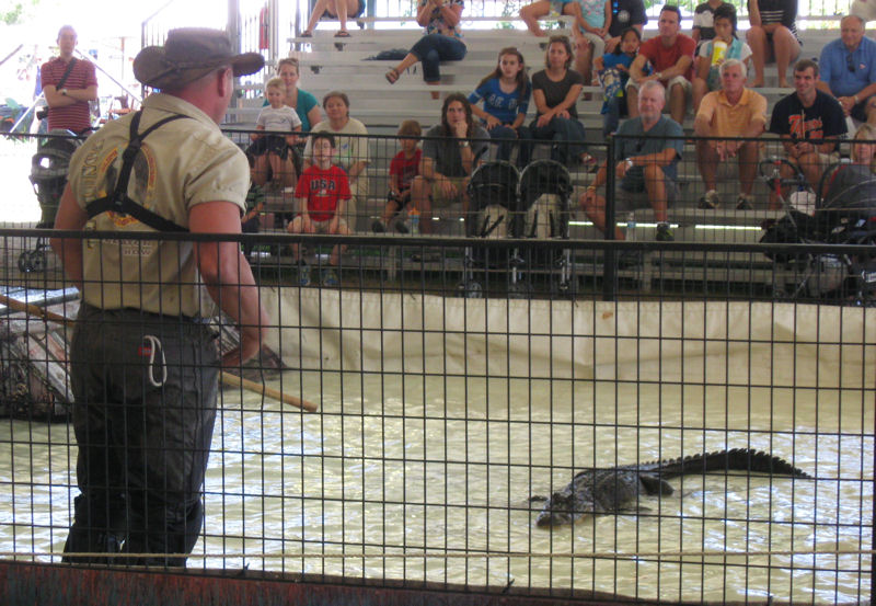 One of this year’s freebies was a traveling roadshow called “Kachunga and the Alligator”. The basic premise was several minutes of stage patter about swampland conservation and animal rights, followed by a few minutes of a man tussling with a modest alligator.
