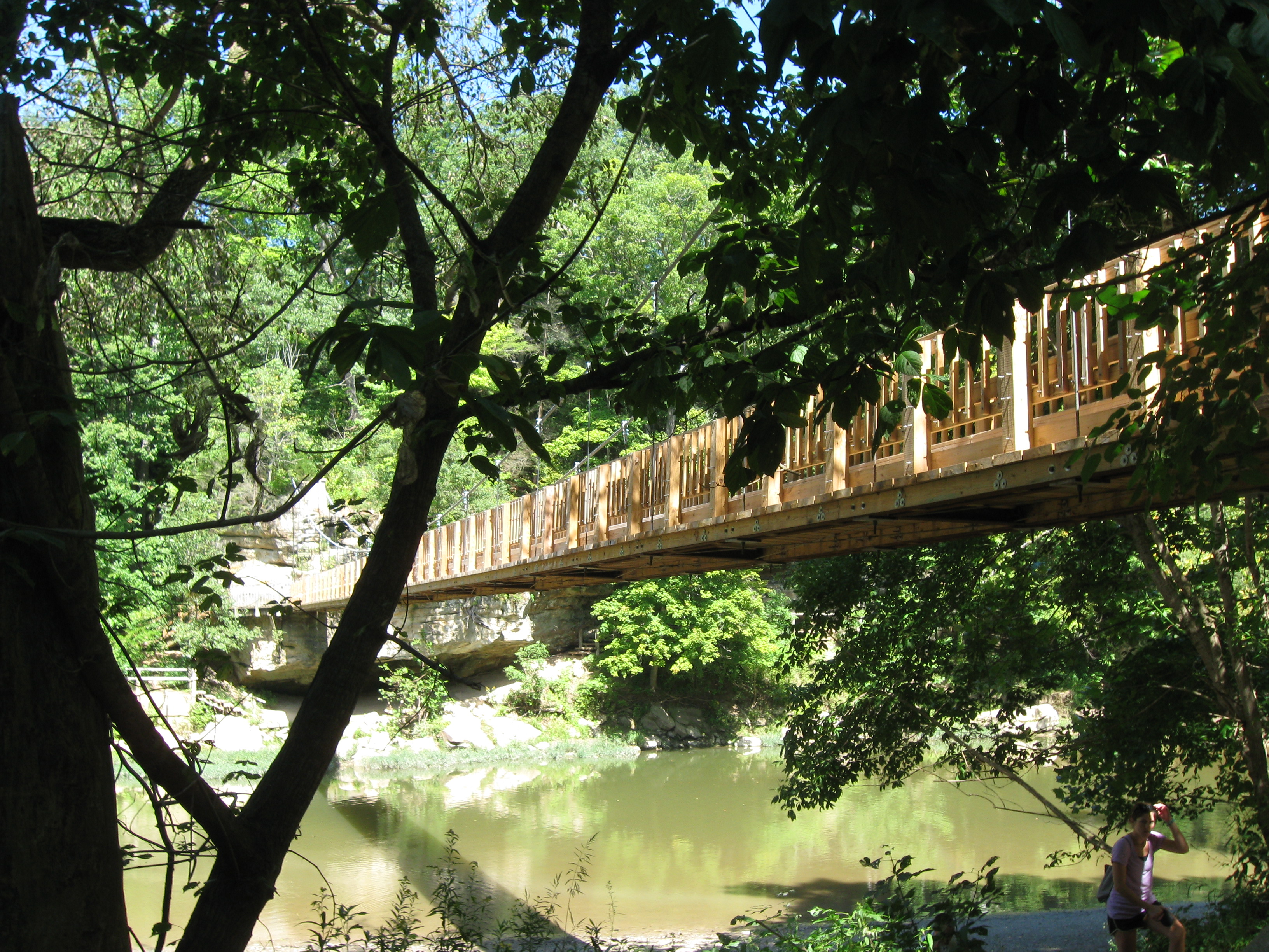 Swimming and wading across Sugar Creek are forbidden by ominous signs that swear to you, “DEATHS HAVE OCCURRED”. I’ve found no online evidence of any, nor have we seen any hint of these past misfortunes resulting in a haunted creek. Regardless, a handy suspension bridge is your key access point to more adventure and less small talk.