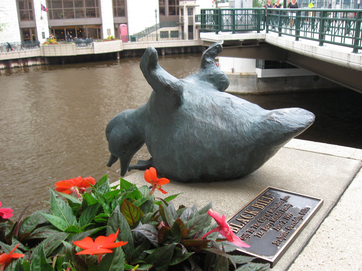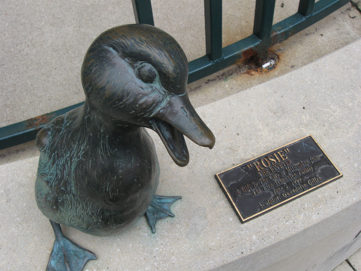 The Riverwalk also hosts another series of 1997-1999 statues centered around a famous 1945 news story involving a duck named Gertie who laid her nest under the Wisconsin Avenue bridge, whose much-needed repairs were delayed so Gertie’s eggs could be given time to hatch. Her plucky story of determination and birthing rights apparently gave much-needed hope to a city in need of happy news in the wake of WWII.