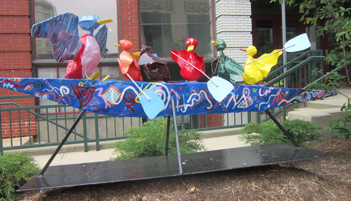 The 2007 steel sculpture called “Gertie Gets Her Ducks in a Row” recounts the tall tale in which, according to secret legend, Gertie and her children would later form their own international rowing team. Their efforts won them several competitions, including a decisive victory in the 2008 Beijing Olympics against the Winklevoss twins.