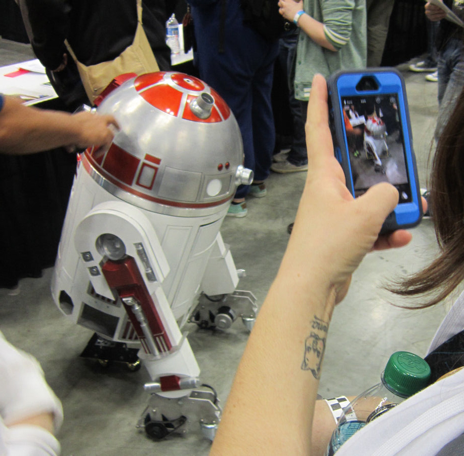 For ten minutes we loitered in the open space at the edge of the cordon. A volunteer announced to our growing crowd that anyone who wasn’t in line needed to exit the area and come back later. We obeyed the letter of the law and rejoined one of the photo-op ticket sales lines, cleverly disguising ourselves as people who still needed to buy tickets. We hung out there for several more minutes until the Point of No Return, bailed out and hid in the line for buying Carrie Fisher autograph tickets. Our disguises required zero adjustment.