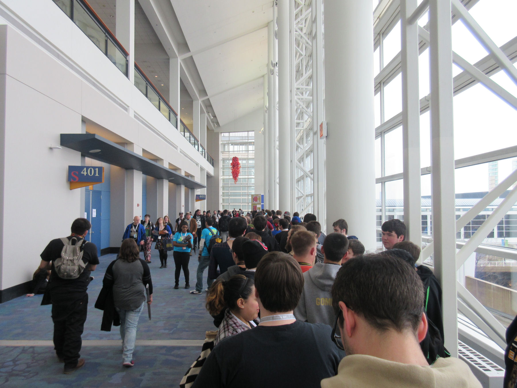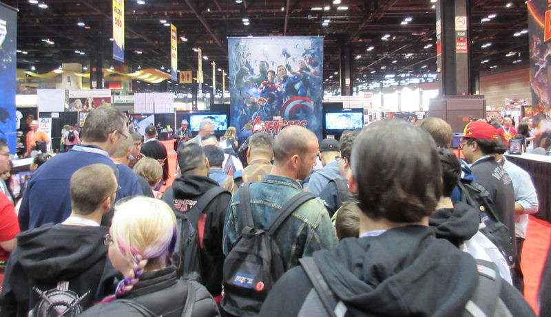 The line to Marvel’s “Secret Wars: Battleworld” panel was adjacent to the easternmost wall of McCormick Place’s South Building. Out the window, Lake Michigan is the horizon. Or you can keep your gaze inside the windows in search of more cosplayers. At one point I saw an old friend walking on the other side of the hall, but this was at the exact moment that a Main Stage panel had let out, so several hundred fans were crossing between us and disrupting all communication efforts. Hopefully we’ll catch her at another con someday.