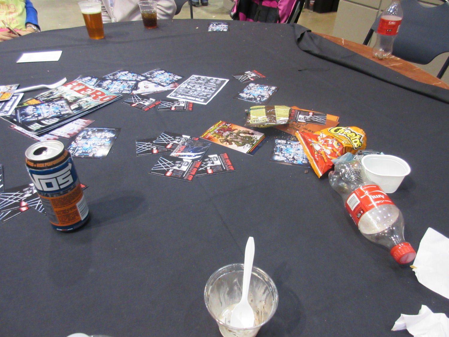 After the Other Space screening panel and lunch, we wandered the exhibit hall again, but didn’t spend much more. Since we were still old and not yet recovered from Friday, we had to call mandatory snack time more than once. Anyone who’s ever grabbed a seat at a con is familiar with the standard garbage pit found at the center of every table, a collection of other geeks’ food wrappers, empty cups, and unwanted free handouts from the dealers and publishers. If you find a clean table devoid of litter, IT’S A TRAP. The table is probably alive and ate the previous squatters. RUN AWAY.