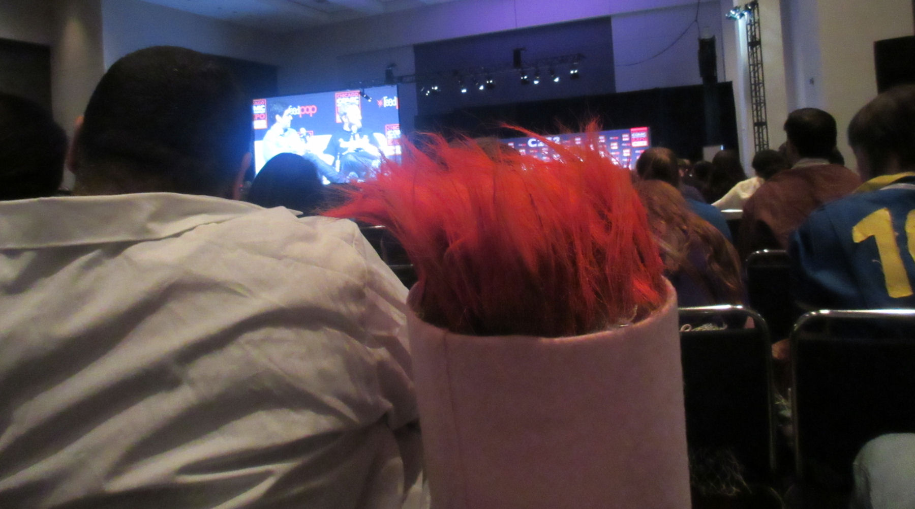Eventually we worked our way up toward the front as other attendees fled for their lives. The existing panel ended and was followed by a geek trivia tournament. That sounds fun in principle, but we watched rather than participate because we figured there’d be questions about newer universes we don’t know. We were right. We knew answers to more than a few questions (I was proud to know some Bioshock trivia), but those who scored highest and took home prizes also had to know stuff about things we’ve never watched, read, or played — Shadows of Mordor, Insurgent, Steven Universe, The Maze Runner, etc. A disappointing number of questions were about either Gravity Falls or Dragon Age, because those are now the only two universes in the entire geek multiverse, I guess.