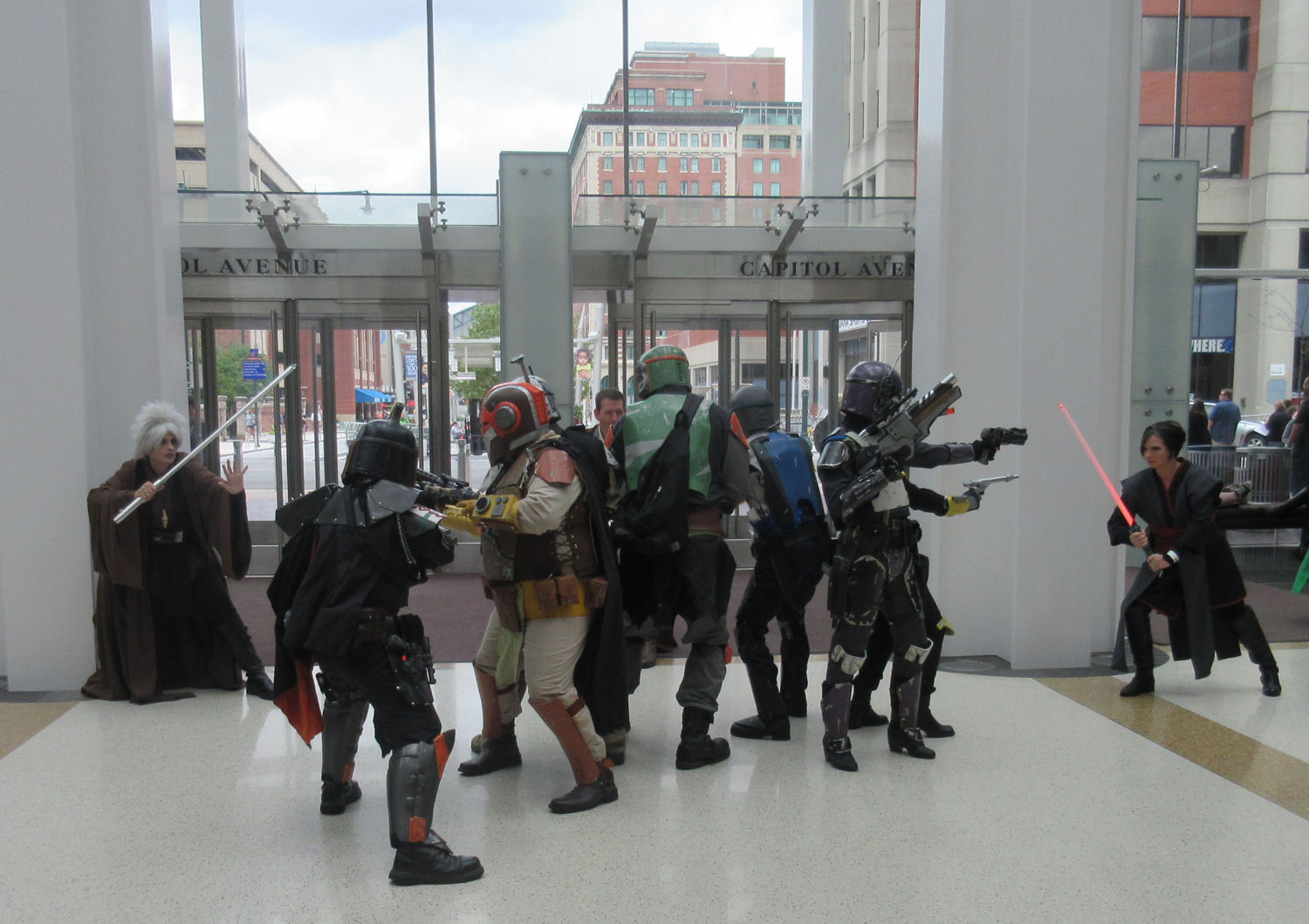Mandatory Star Wars! Jedi vs. Mandalorians in a duel to the death for control of the Convention Center’s Georgia Street entrance. The winners get to stay in canon.