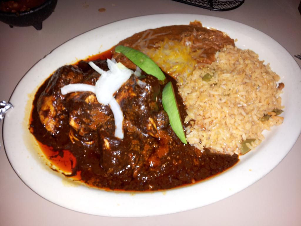 My meal: Mole con Pollo. From the menu description: “a blend of deep-fried Mexican peppers, almonds, peanuts, raisins, cinnamon sticks, plantain, bread, sesame seeds and dark chocolate, then smothered over a slowly-fried chicken breast, served with rice, beans tortillas. Garnished with slices of onions and avocados.”