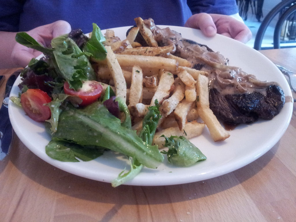 And this was my wife’s Boeuf Bourguignon. Hers was easier to order because Boeuf Bourguignon isn’t quite so uncommon. I think Swanson used to make a TV-dinner version, except they spelled it “beef”, probably because focus groups declared surplus vowels unnatural and unpatriotic.