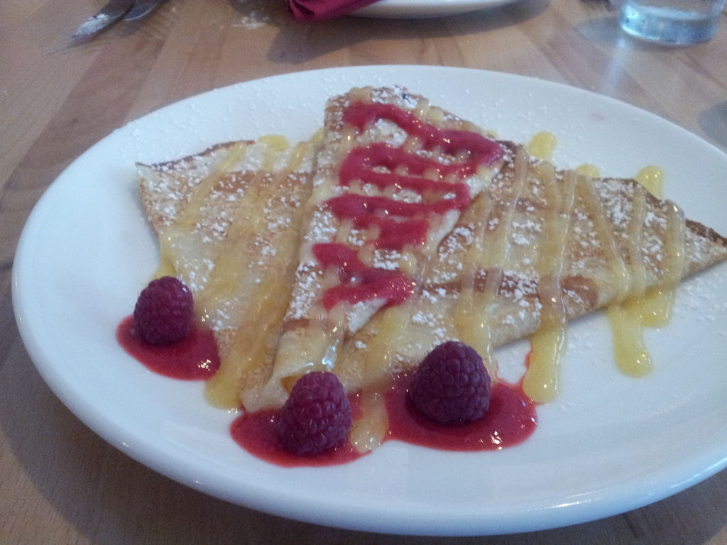 For my birthday dessert, La Crepe a la Creme de Citron Faite Moison — crepes with lemon cream and raspberry coulis. This was my first time witnessing a coulis outside of a Chopped dessert round.