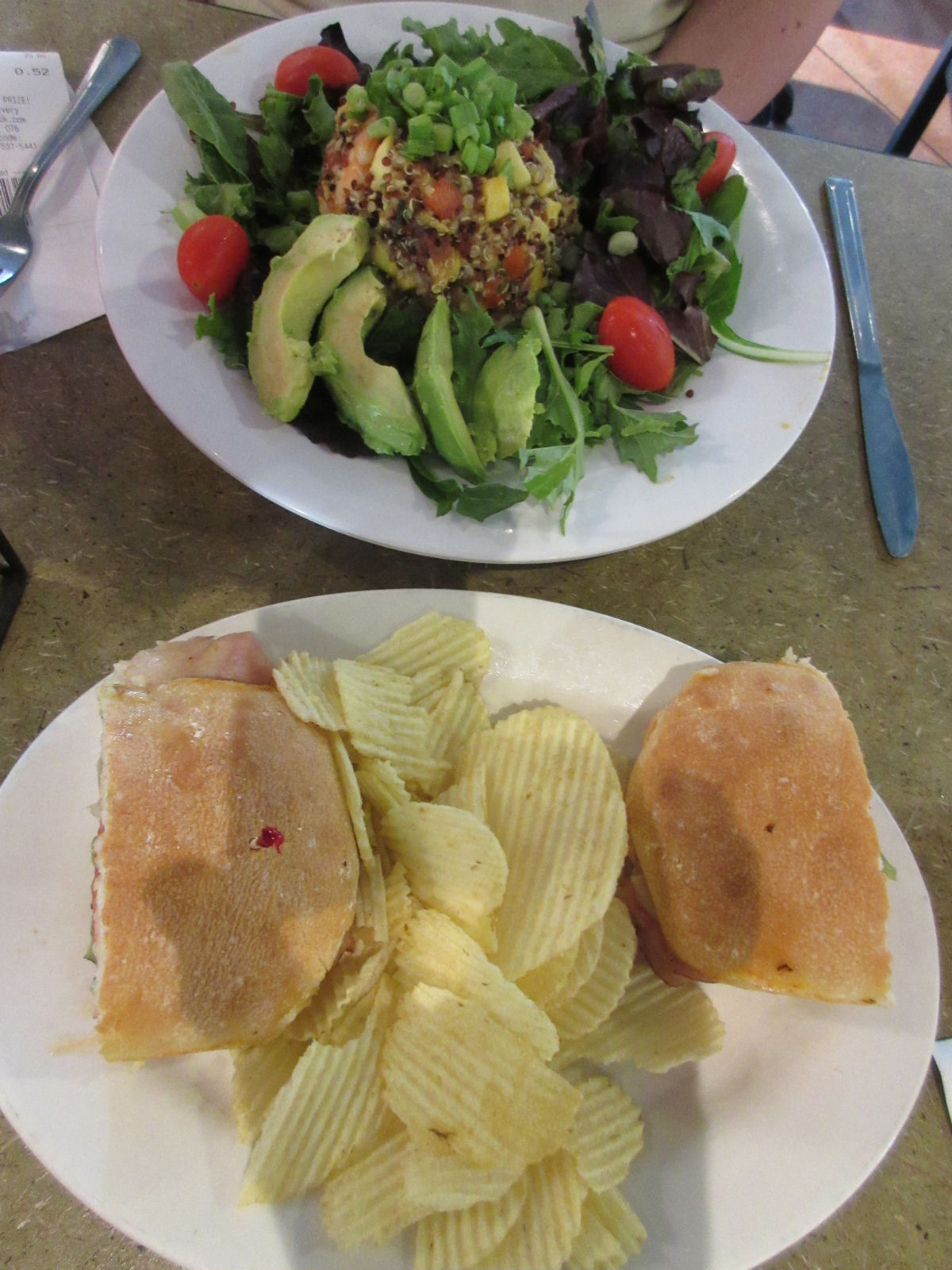 Tonight’s feature presentation: for me, the Pork Veracruz special, a sandwich topped with chipotle mayo, muenster cheese, Roma tomatoes, green chilies, and onions on telera bread. For her, the Quinoa Shrimp and Mango Salad — tossed with Gulf shrimp, mangoes, avocado, grape tomatoes, and whatever “Pickapeppa Sauce” is. The internet is telling me it’s Jamaican.