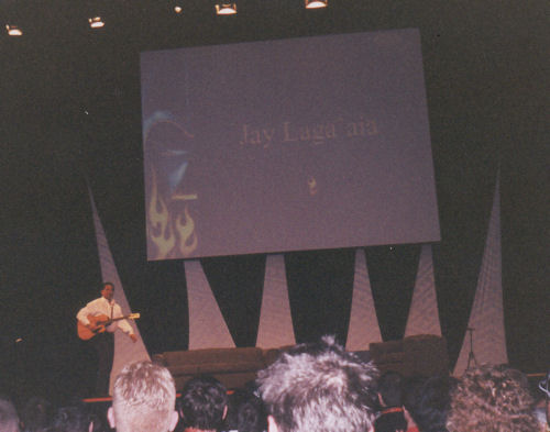 From one of the few Q&As we photographed: Jay welcomes the acrobatic Ray Park! Curse our lousy seats and primitive picture-taking tools.