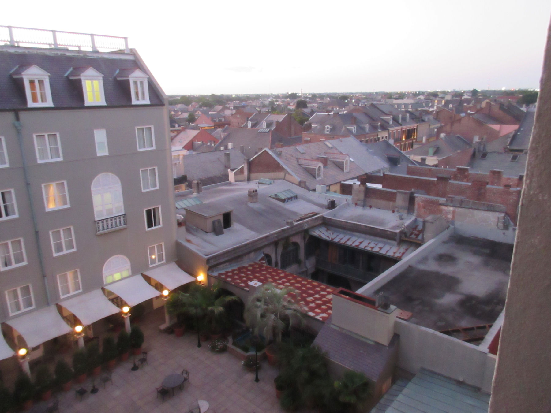 Our room window gave us a non-scenic view of another building’s boring walls, but we found a vantage on the top floor that let us see across the Quarter. Sadly, for some reason our badges were denied access to all parts of the roof, so this was the best we could do.