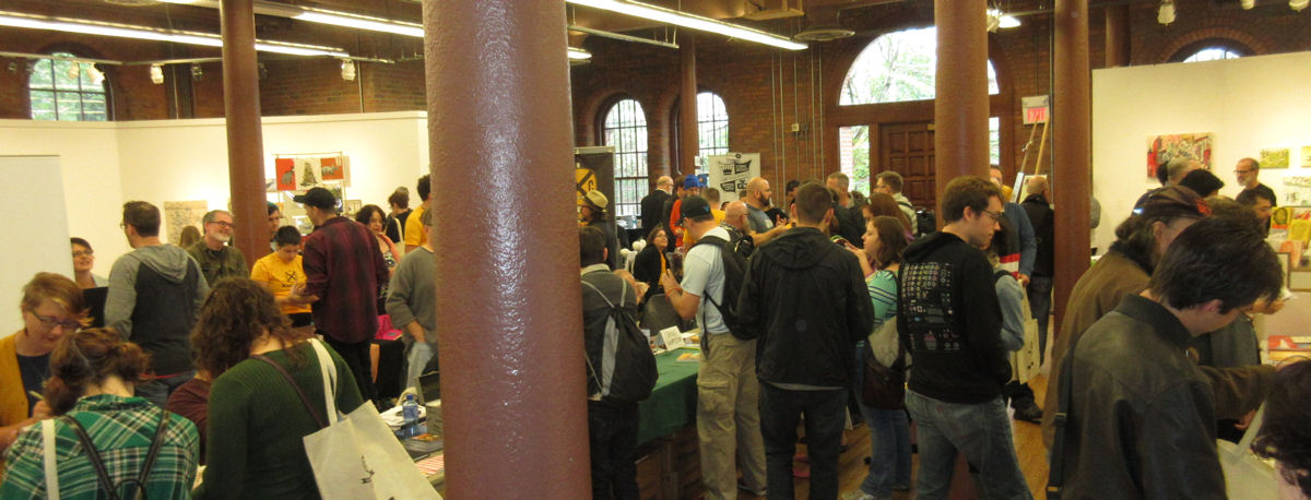 This weekend ushered in the inaugural Cartoon Crossroads Columbus, an intentionally different comics show from what we’re used to seeing here in Indianapolis. As conceived and executed by Bone creator Jeff Smith, Comics Reporter journalist Tom Spurgeon, and no doubt a sturdy support network of other talents, CXC promised no actors or celebrities, no mainstream publishers, no costume contest, no cosplay, no gaming, no super-sized convention center, no inedible convention center food, no back-issue longboxes, no action figures, and no bobbleheads. CXC was an aesthetically purified form of literary/art show about comics, featuring a lot of people who make comics better, from within the local community as well as from distant parts.