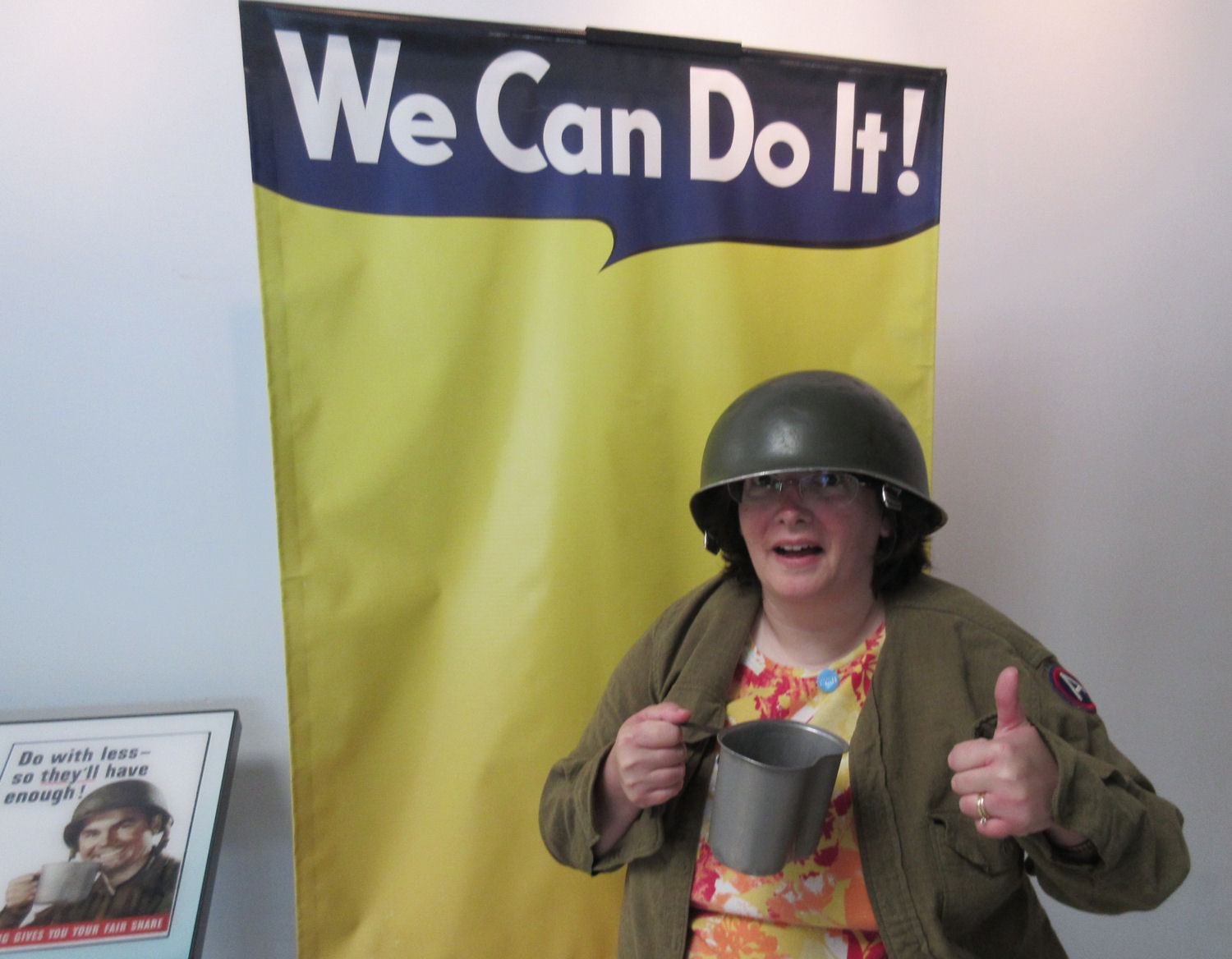 A second-floor niche in the Louisiana Memorial Pavilion — i.e., the admission building — contained a pair of famous backdrops and corresponding props that guests can use in homage to their favorite wartime posters. We acted a bit hastily and didn’t notice the other backdrop several feet away labeled “Do with less — so they’ll have more!” Anne is consequently using the wrong props in front of Rosie the Riveter’s motto. Our bad.