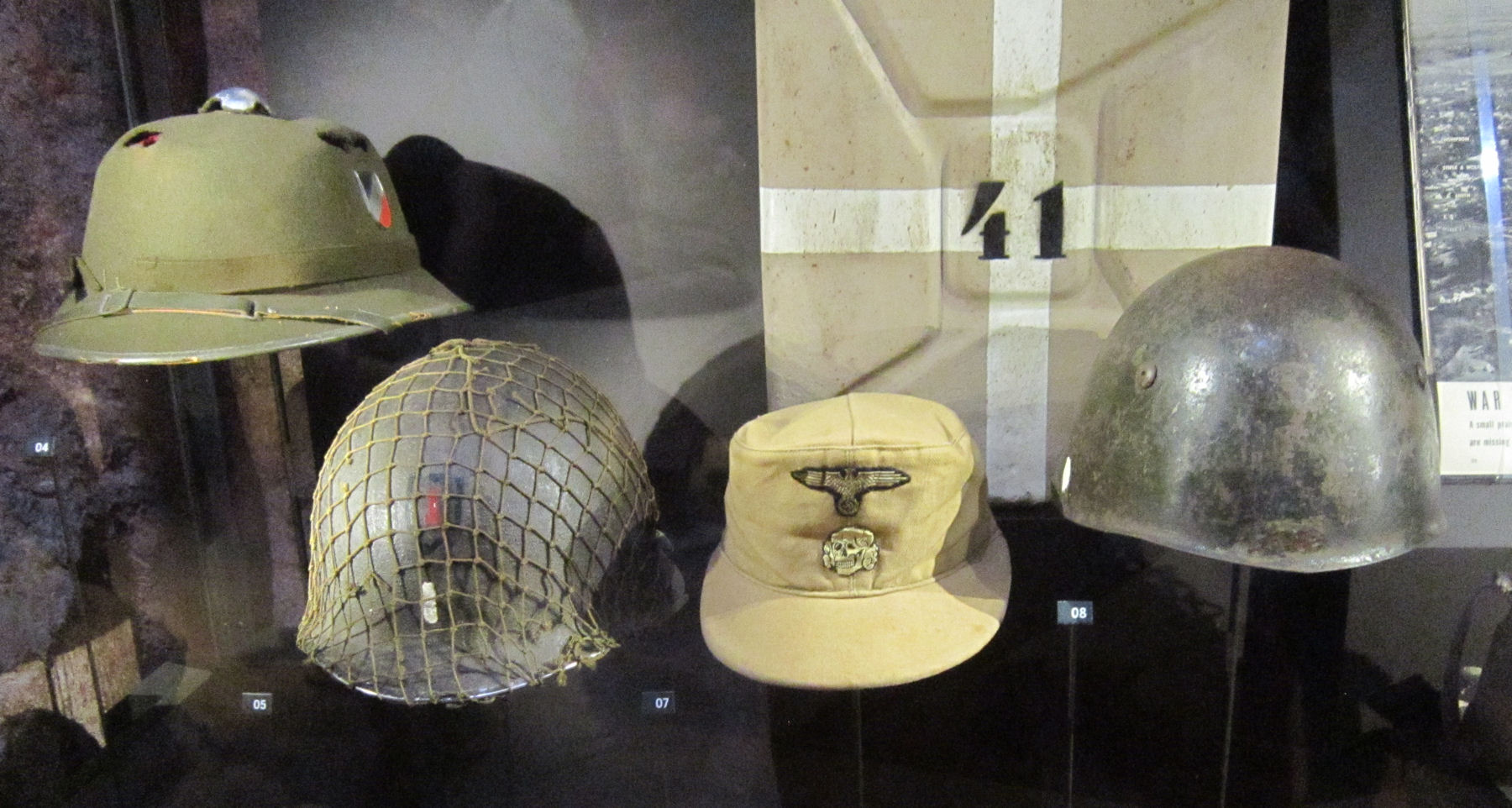The WWII story as told in hats. Left to right: German pith helmet, US Infantry helmet, SS tropical cap, Italian M33 helmet.