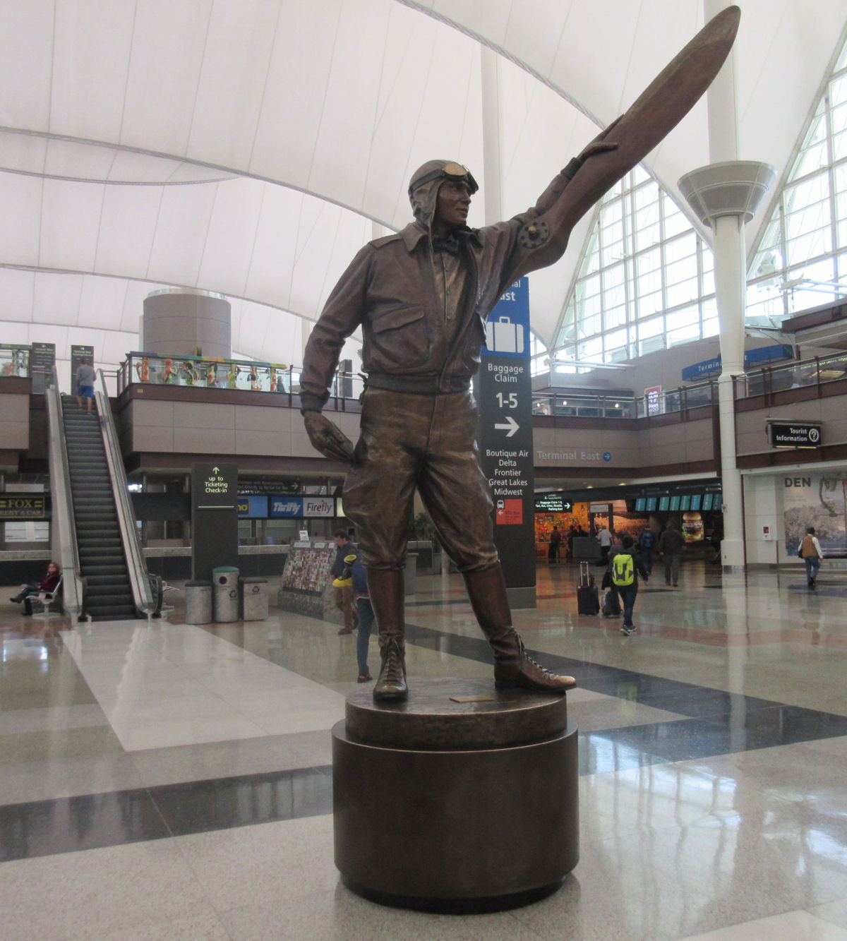 Our Indianapolis International Airport welcome committee: WWI flying ace Harvey Weir Cook, who flew for the Army Signal Corps with seven victories to his credit, then later for the newly invented transcontinental airmail service. He was a colonel when he died in 1943 while training other men to be just like him. The terminal and major airport thoroughfares are named after him.
