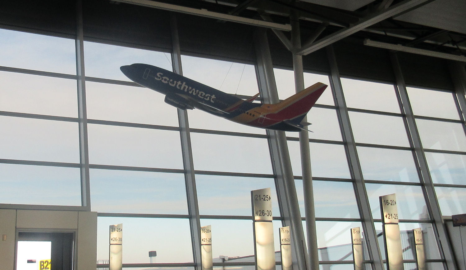 Southwest Airlines occupies the far end of Concourse B, the left-hand prong. We grabbed breakfast on the way at Shapiro’s Deli, a local business that makes a mean bagel. I’d been looking forward to that part since September and wasn’t disappointed. We then reached the Southwest gates about fifteen minutes before boarding time, over an hour since we’d left the car. Already we’d had a long trip and we hadn’t even left the ground or the city.