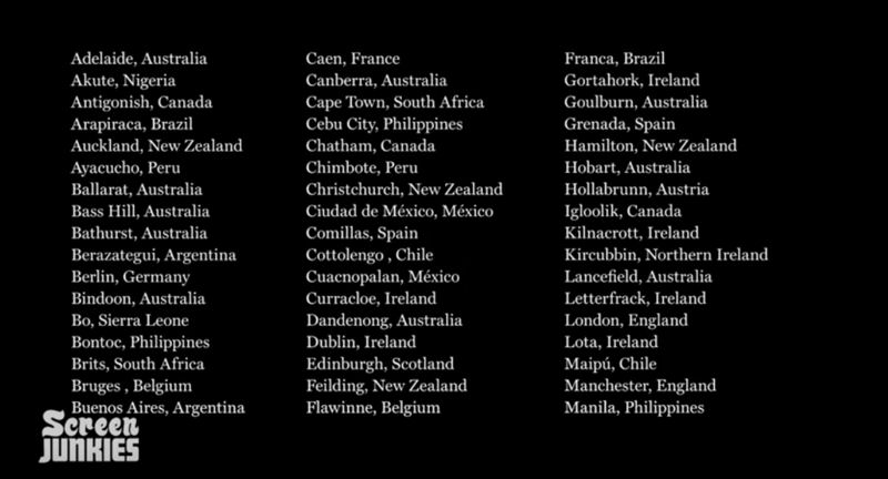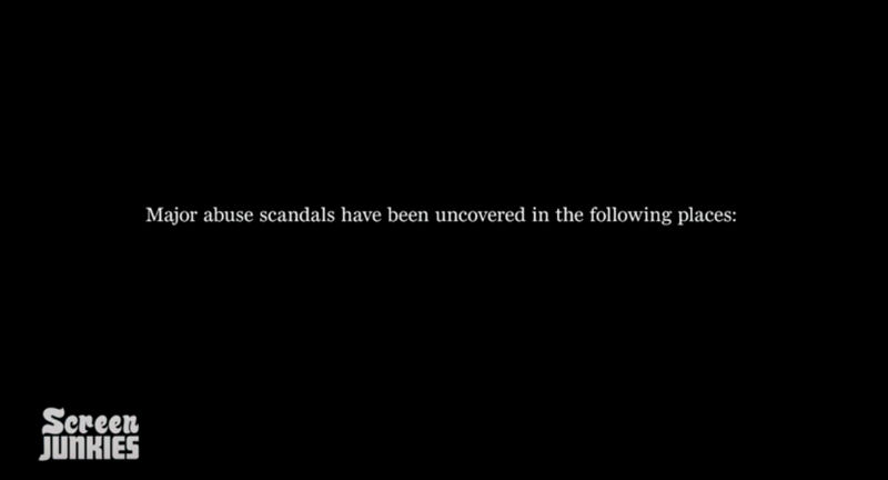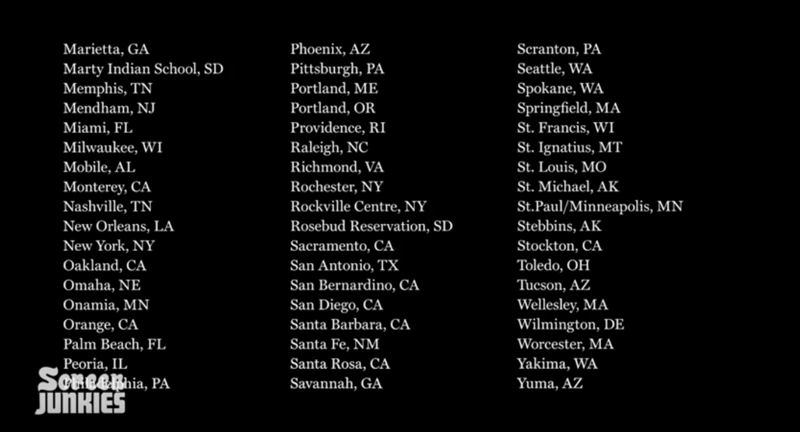 UPDATED 2/23/2016: Thanks to the guys at Screen Junkies and today’s latest Honest Trailer, here’s that end-credits list of cities besides Boston — in America and worldwide — where Catholic sex-abuse scandals have been reported. Not a comforting sight.