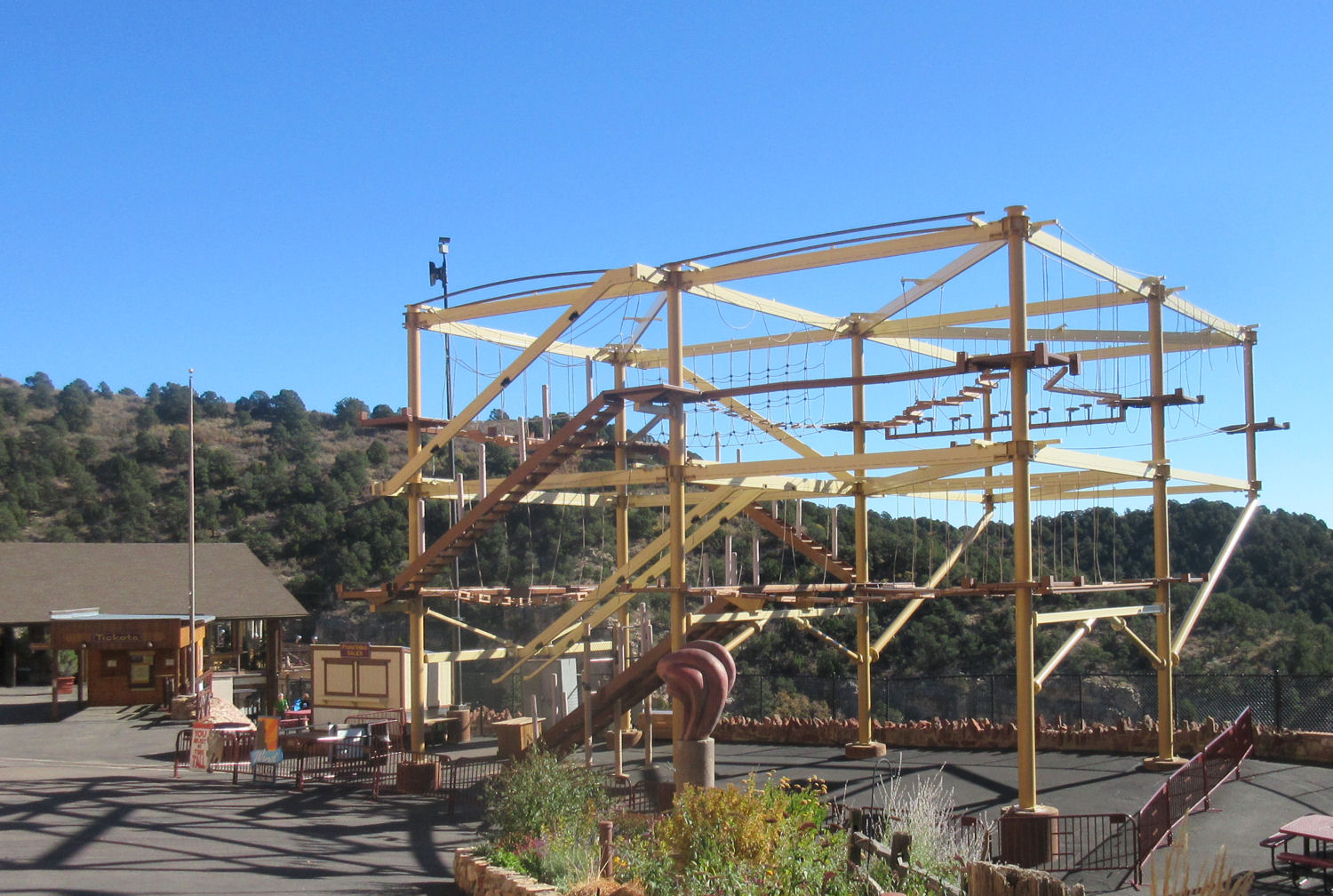 The Visitors Center offers other activities during the warmer tourist-season months, including an amusement park ride that takes daredevils back and forth, a few thousand feet above the rugged countryside. Closer to earth but equally daunting is this obstacle course that looks much more interesting than the average funhouse.