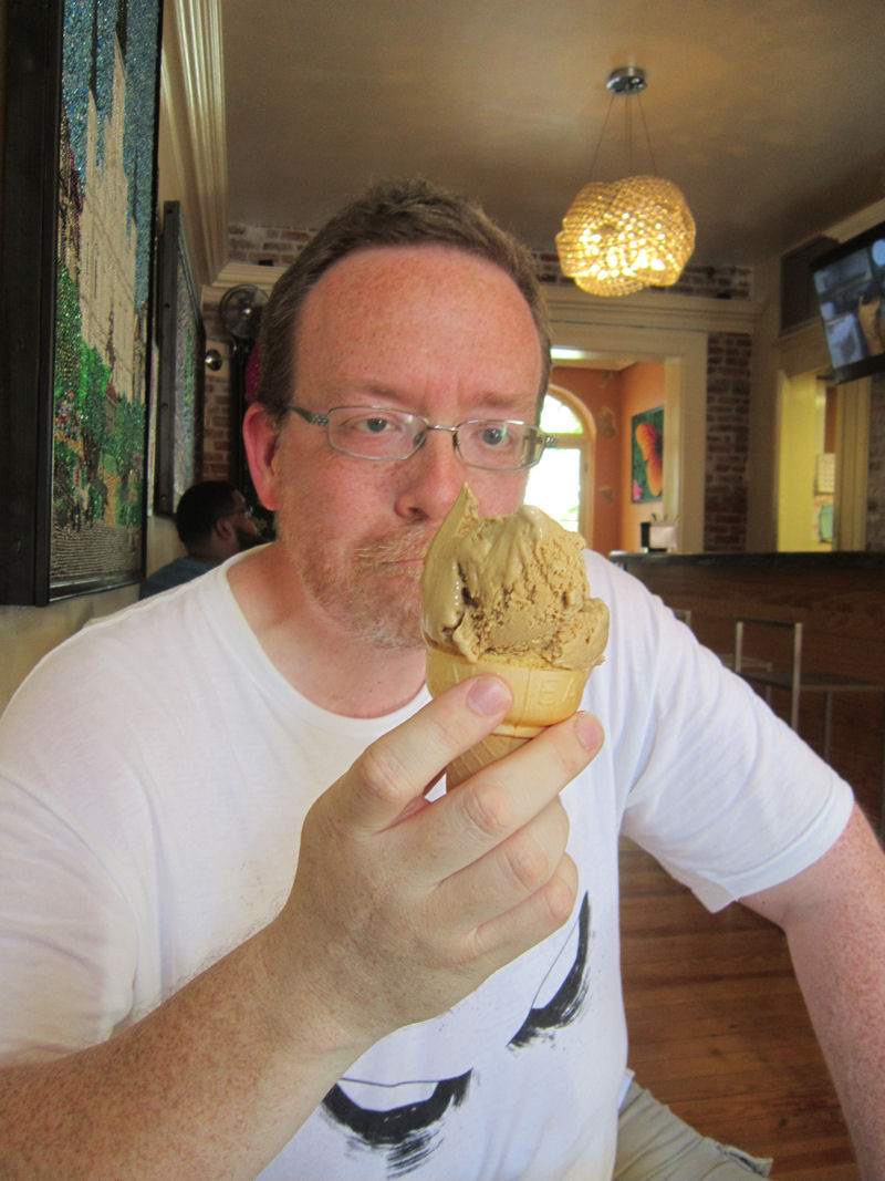 — and you could practically hear the sound of screeching brakes as I mentally rewound the previous fifteen seconds and realized we’d just passed a guy holding an ice cream cone. We backtracked; Anne asked him where he got such a rarity; he pointed a block west of us.