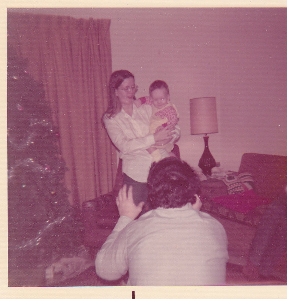 My first Christmas, seven months old. I honestly had no idea Dad stuck around for that long, but I concede the point to the indisputable Christmas tree. Unrelated note: I think my mom still has that lamp.