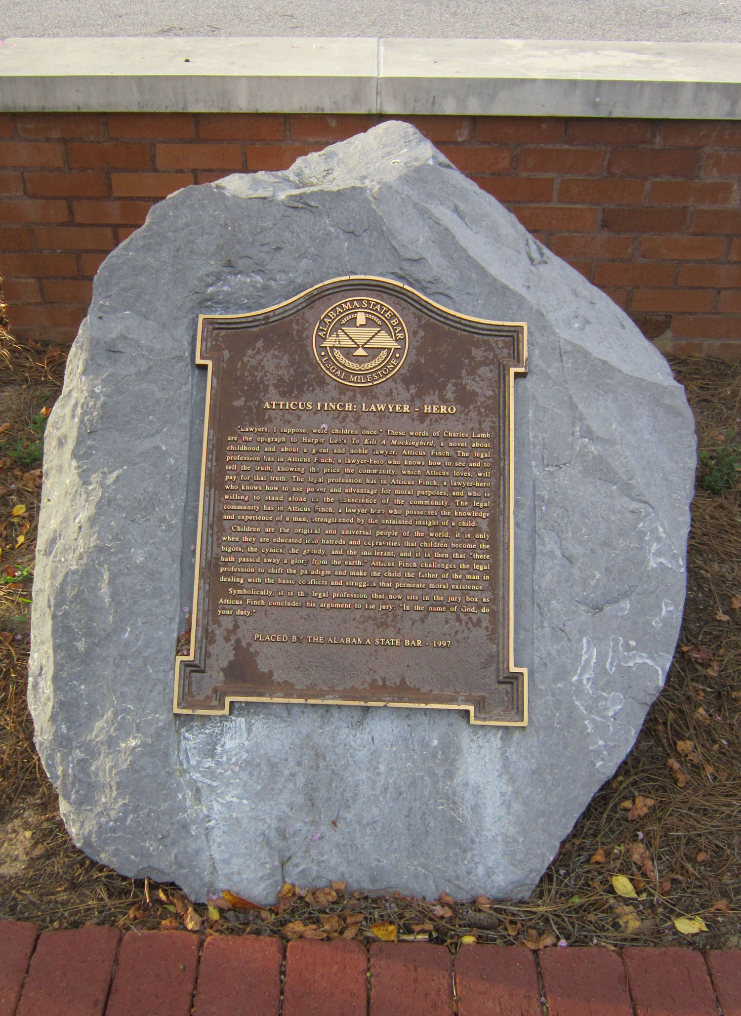 A nearby plaque celebrates the life and works of Atticus Finch, noble hero in the official Mockingbird canon. Alt-universe Finches and any dissimilar, discontinued counterparts from the Mockingbird Expanded Universe can go fly a kite.