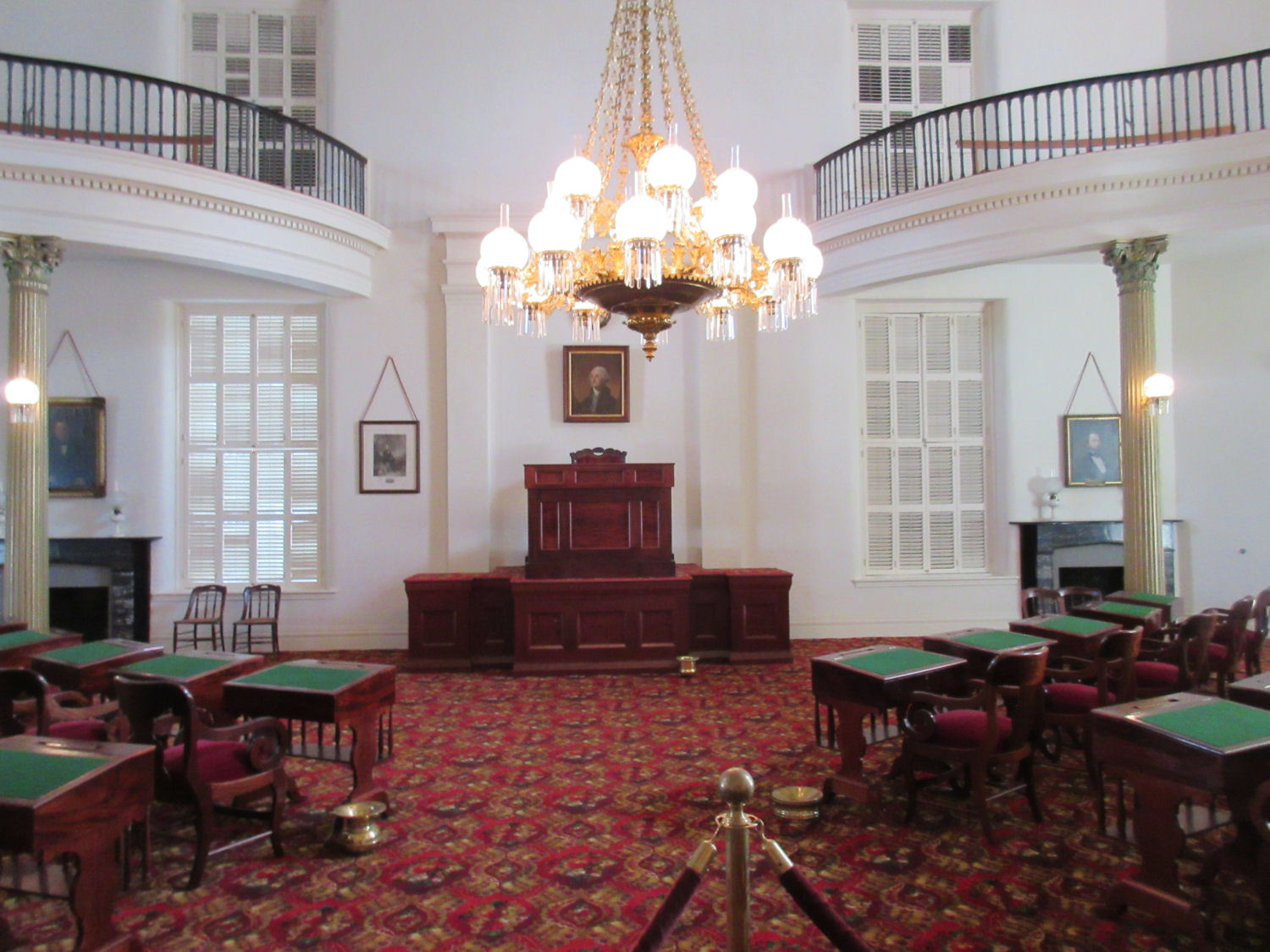 The old Senate Chamber has been meticulously restored to its classic 1861 appearance, complete with oil-burning chandelier replica.