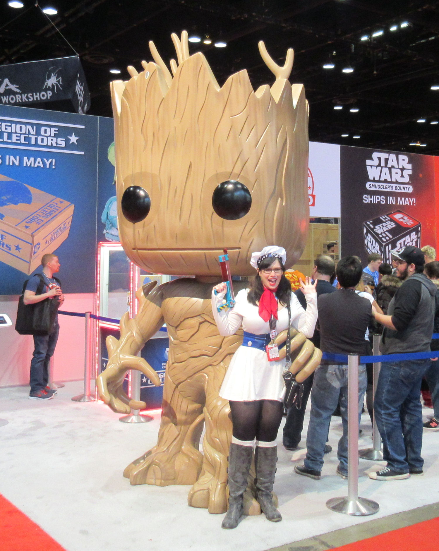 A more tasteful marketing avatar: Giant Baby Groot at the Funko Pop booth, hanging out here with Ms. Sta-Puft.