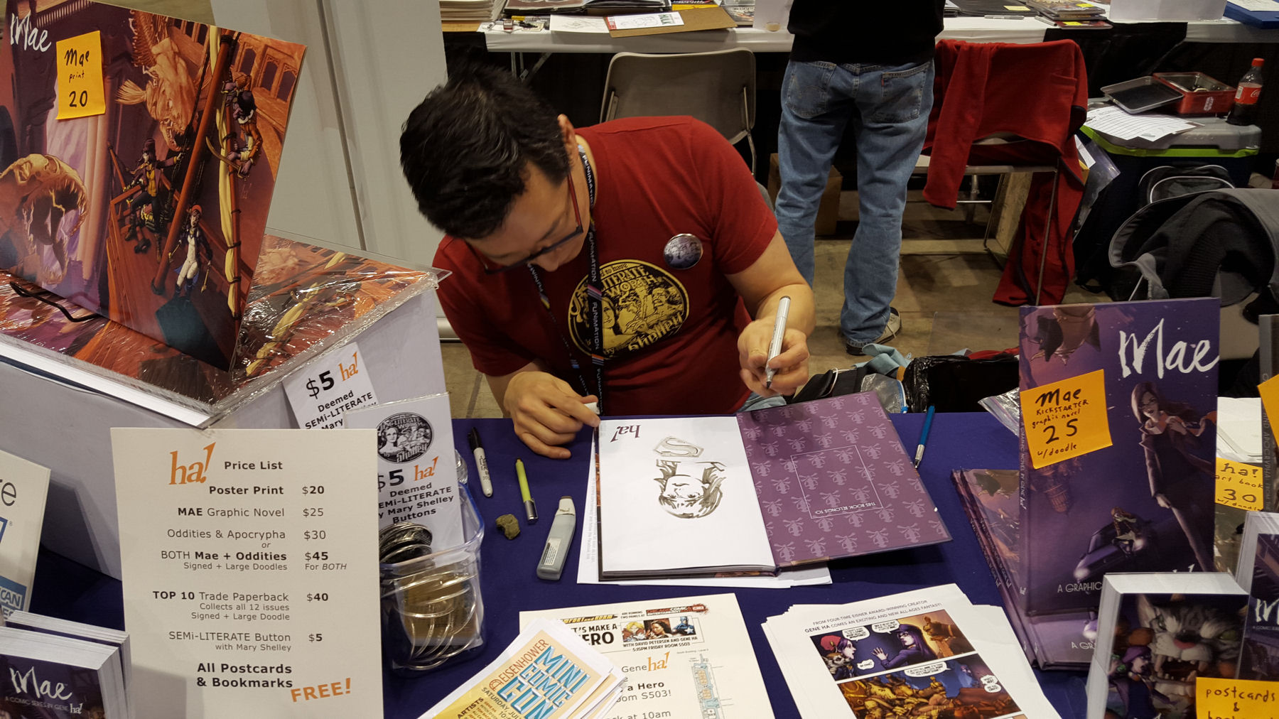I’ve already posted about our second time meeting the great Gene Ha and the wondrous sketch he did for us. Here’s him in action sketching my wife inside the copy of Mae I’d just bought…