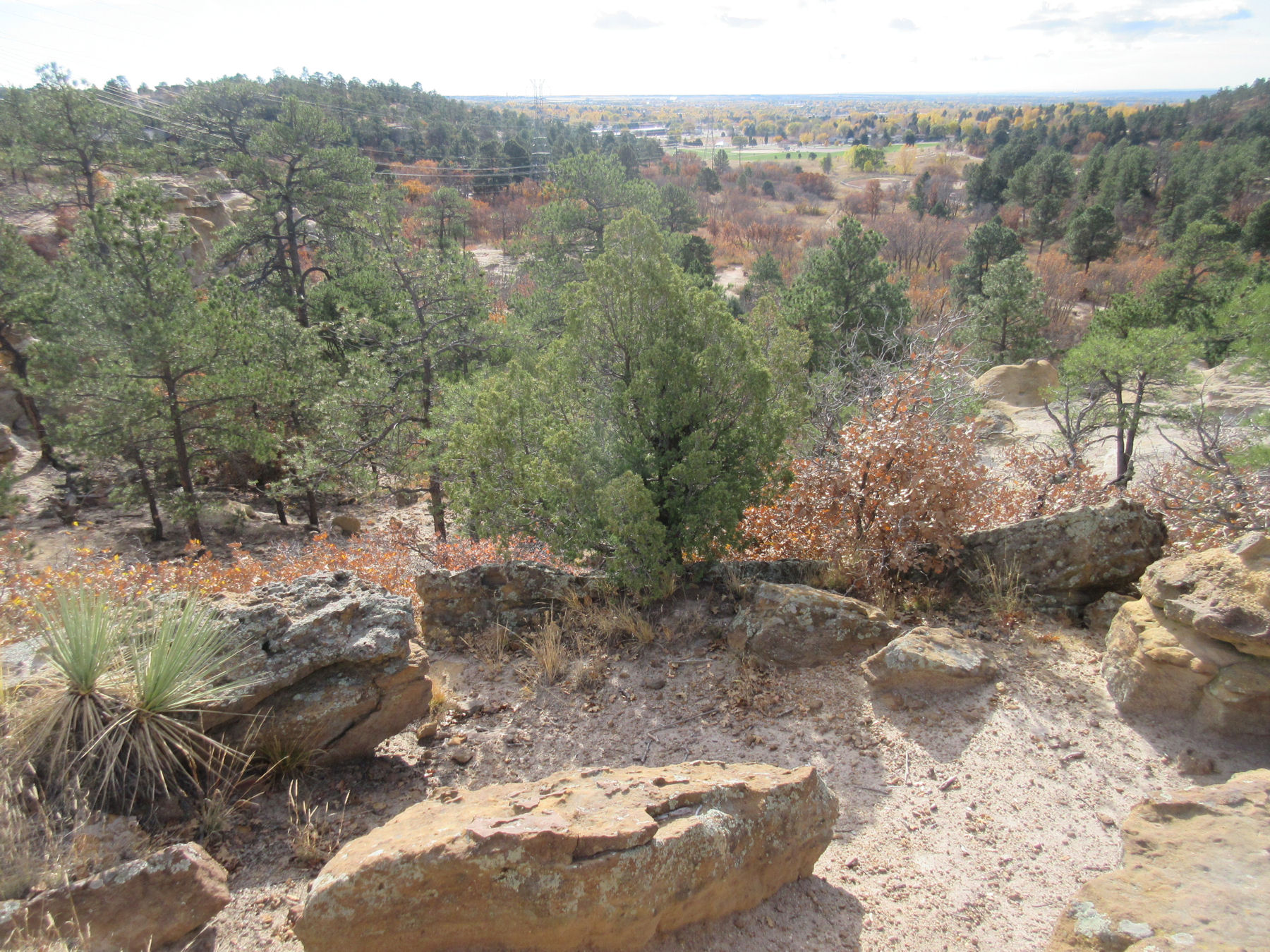 Toward the southwest, the evergreens win the landscape and mask most of the Rockies, except for our old friend Cheyenne Mountain far off yonder.