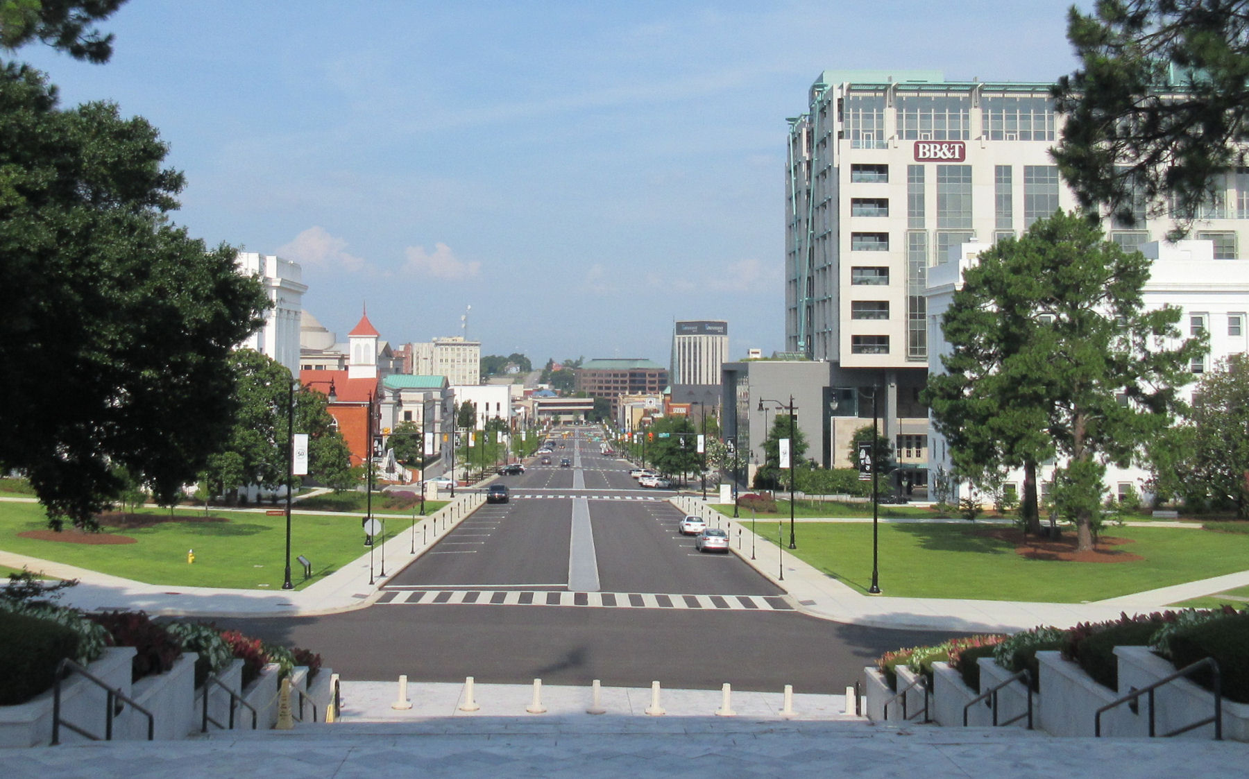 Wide open, nearly deserted downtown Montgomery at 9 a.m. on a July weekday as seen from the steps of the Alabama State Capitol. If I’d known parking wouldn’t be an issue, we wouldn’t have killed ourselves walking it through extreme heat.