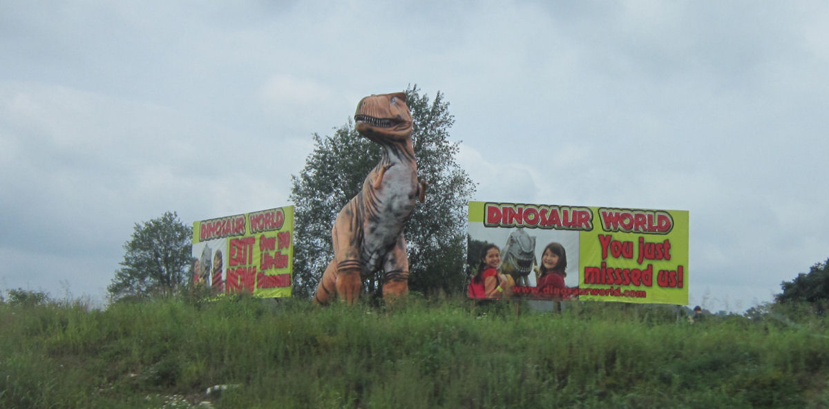 Along I-65 just south of Cave City, Kentucky: a roadside ad for Dinosaur World, which we visited on our 2007 road trip, one of several dozen concessions for my son that year.