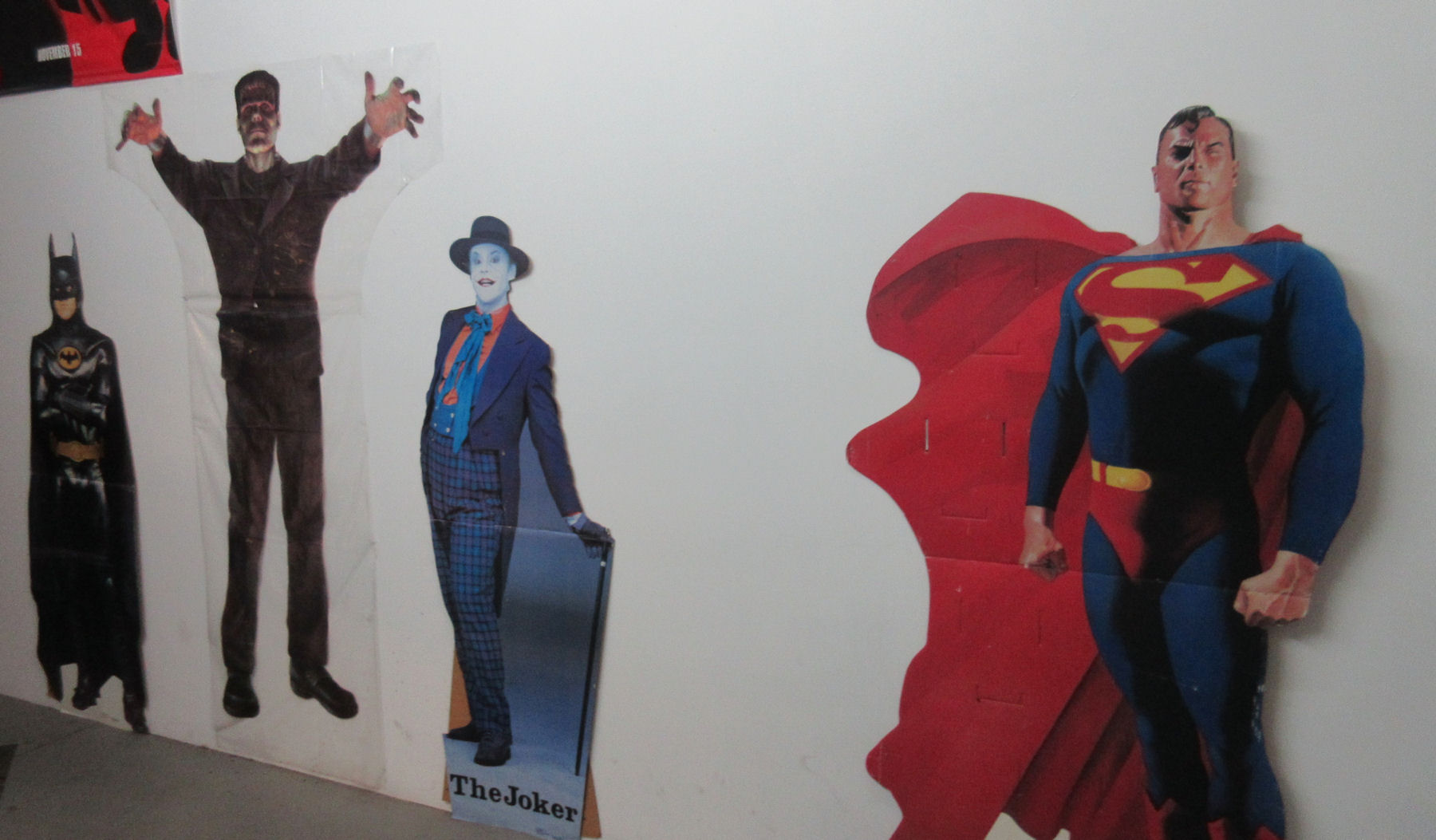 Cardboard standees guard the hallway leading inside Mile High Comics, led by an Alex Ross Superman.