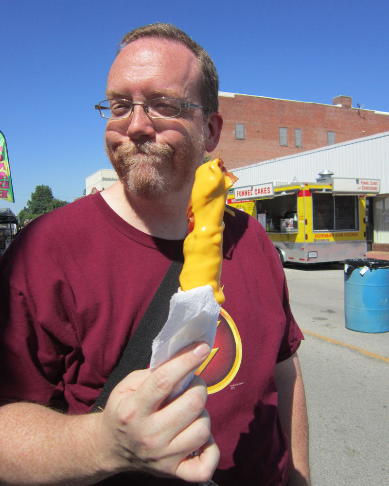 I resolved to drown my sorrows in carnival food. Lucky for me, culinary sinfulness is the secret weapon of every small-town festival, and Metropolis is no exception. Behold a bacon-wrapped quarter-pound beef hot dog drowned in cheese sauce. That’s one way to chase the whiny fanboy blues away.