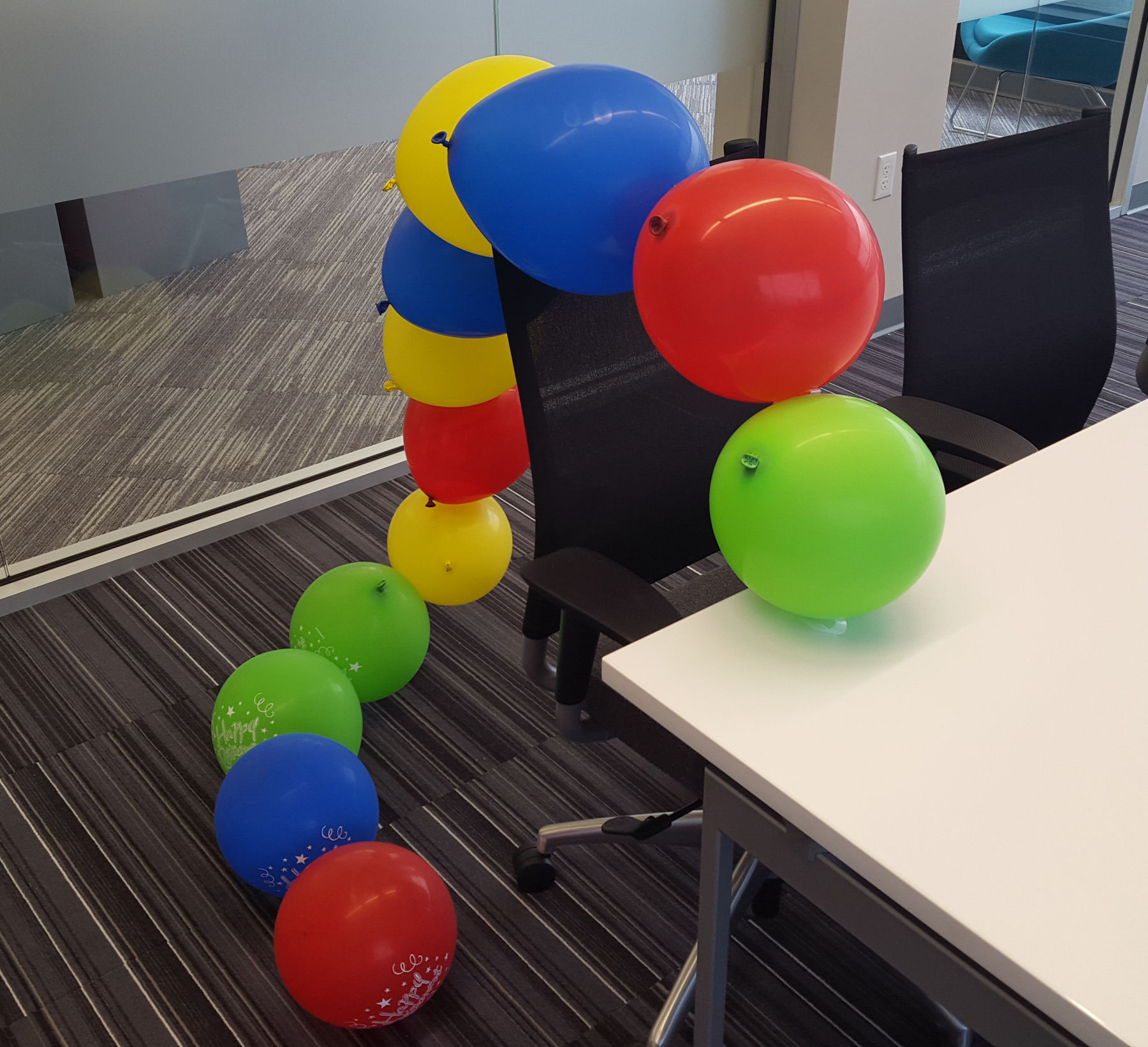 Party decorations included several cheap HAPPY RETIREMENT balloons taped to a whiteboard. I entertained myself during post-party cleanup by sticking the balloons together into an impromptu balloon centipede. And/or another metaphor.