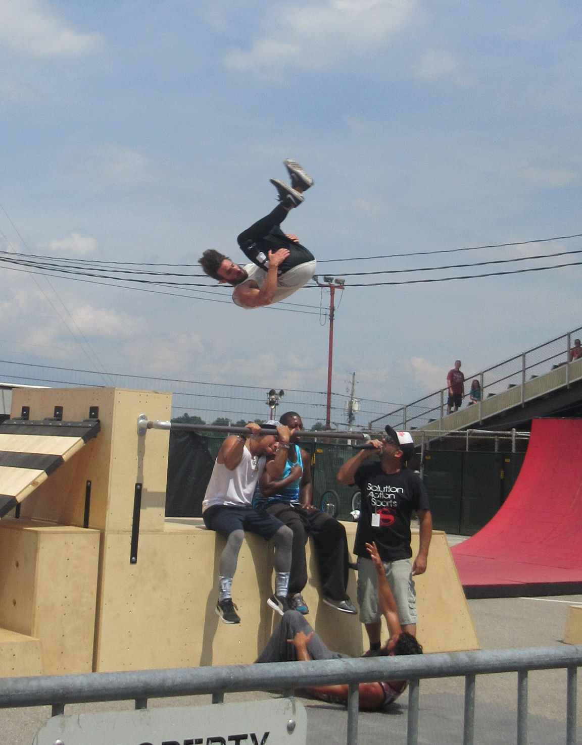 Our Heroes ask for a group of brave volunteers to come on up, sit in a circle, and watch in terror as the guys take turns vaulting over them. Xavier leads off the daredevil display of derring-do.