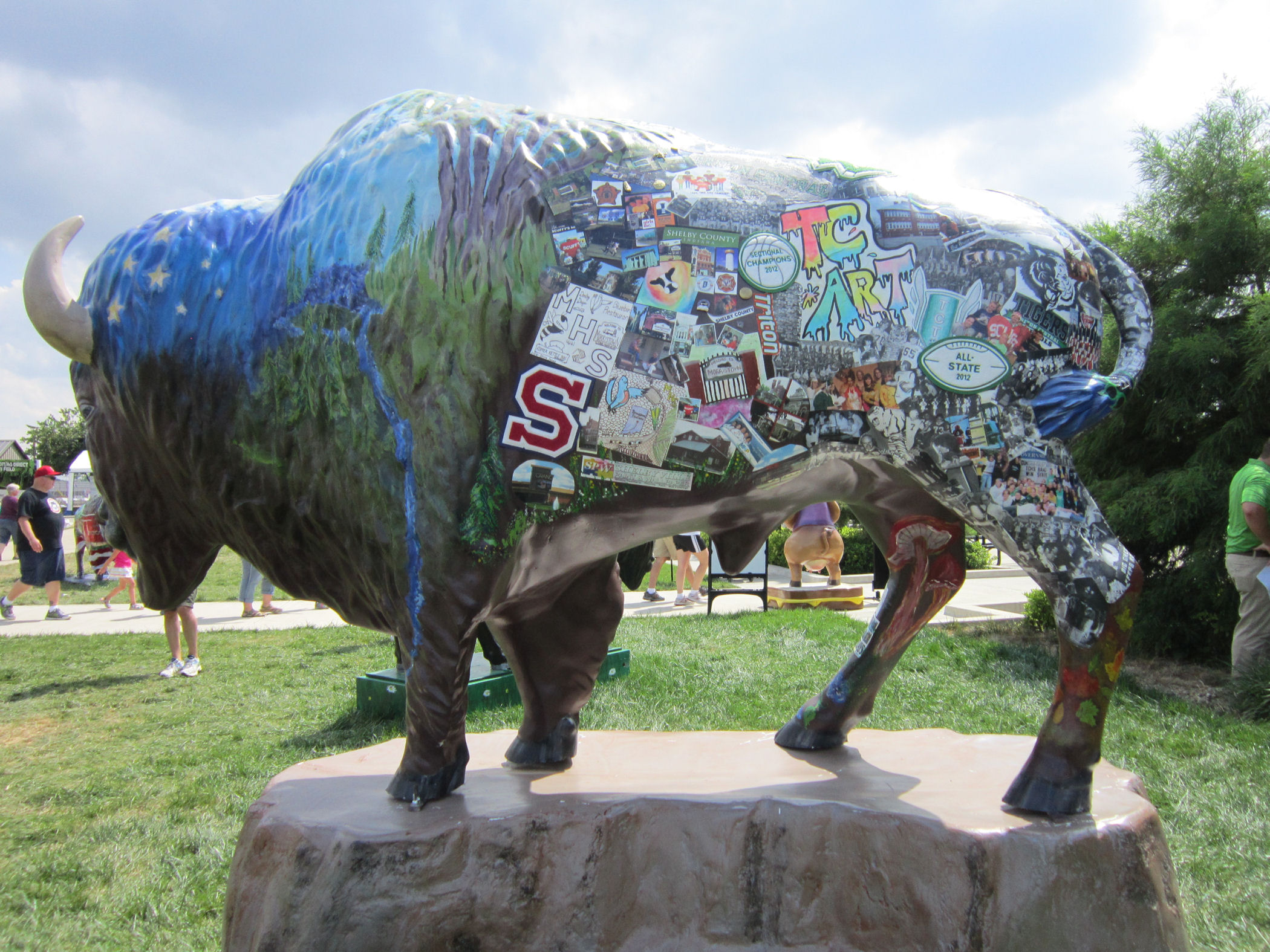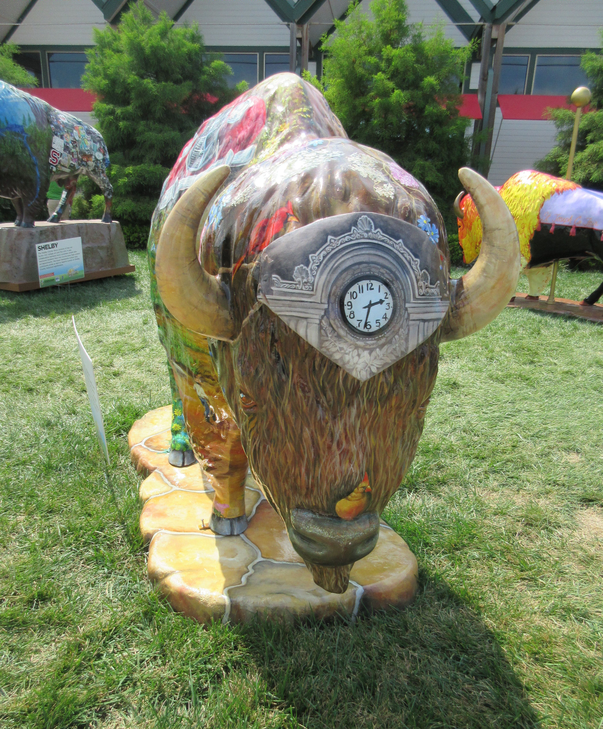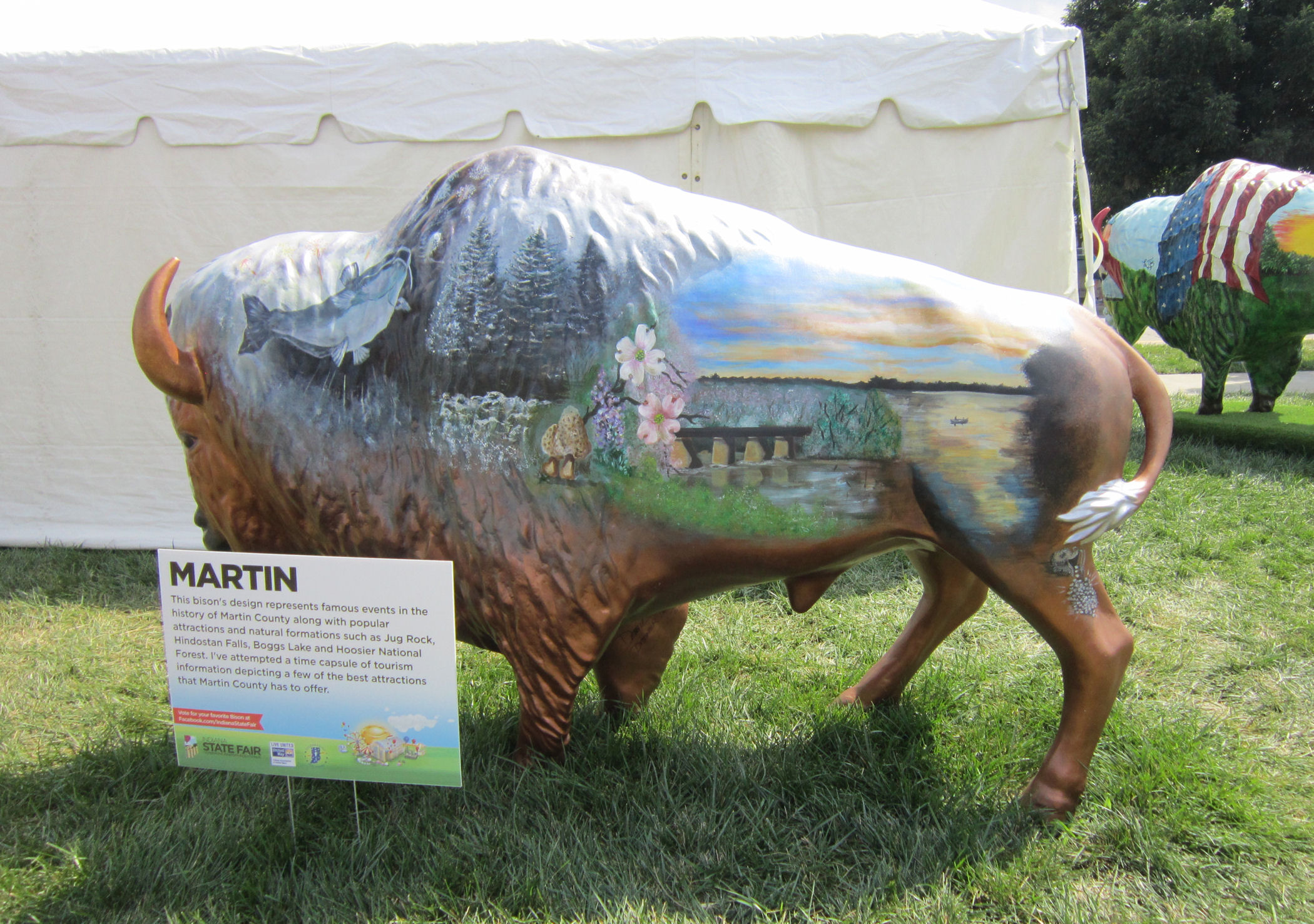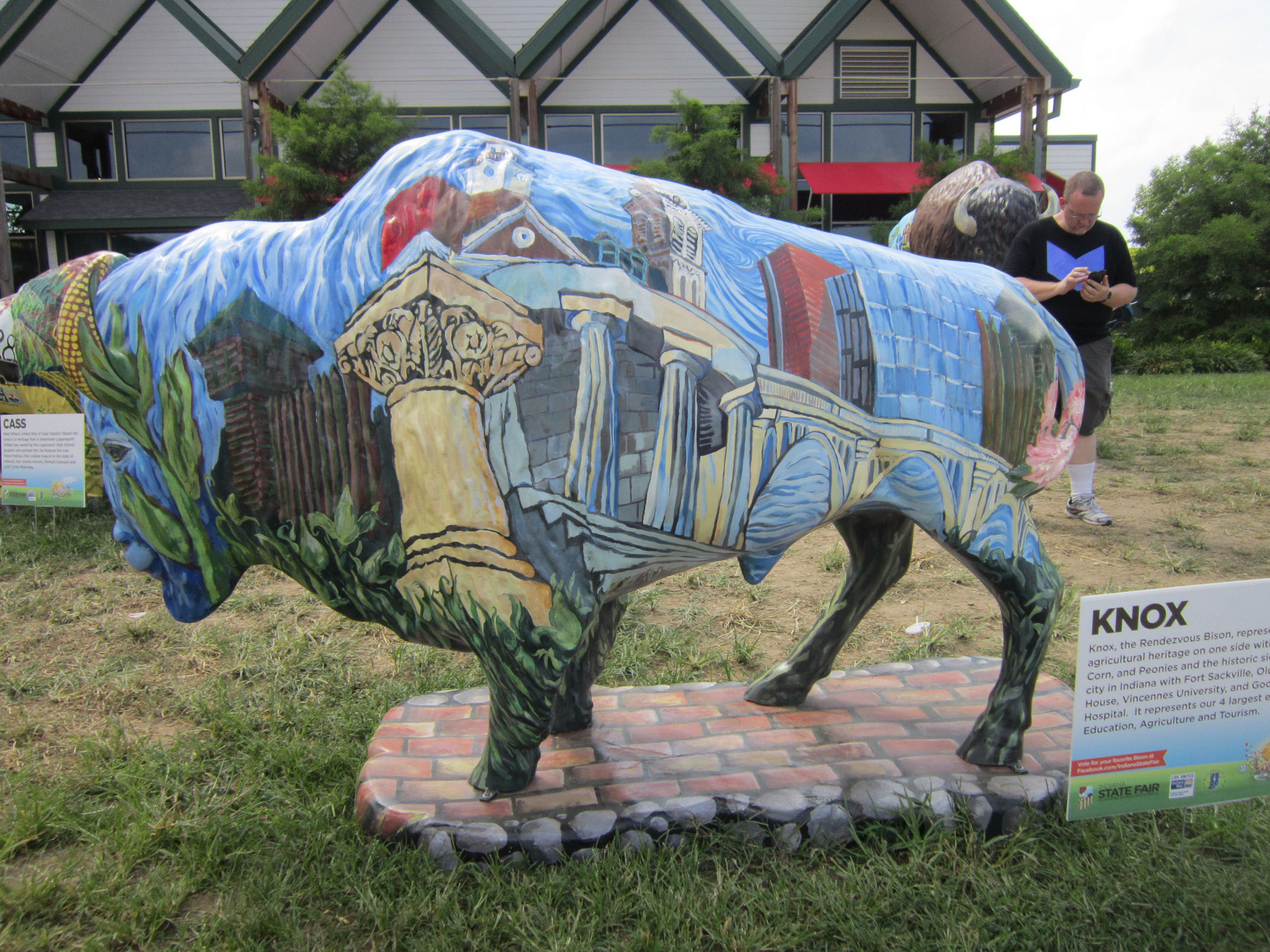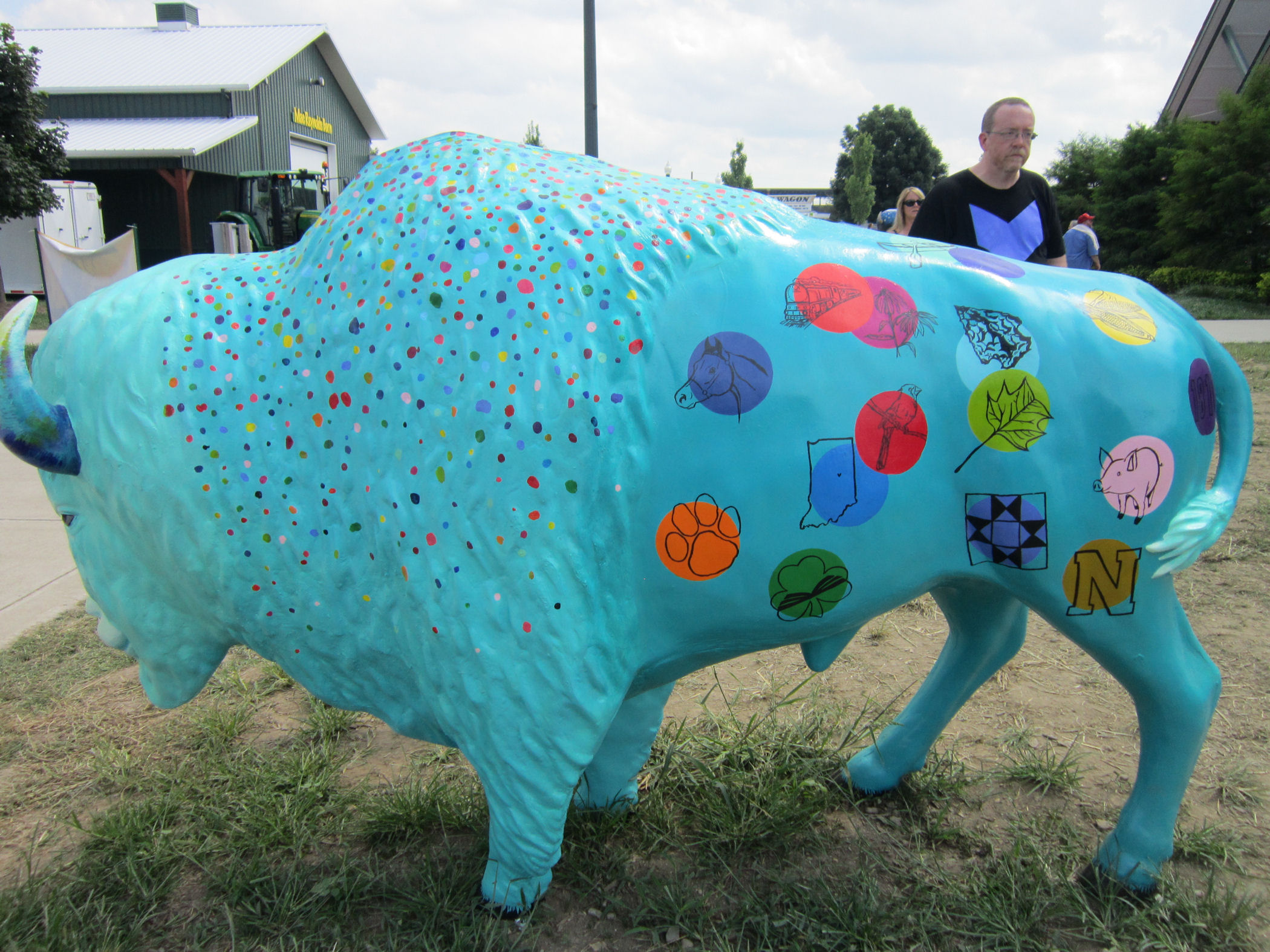 Twenty-five other bison statues were herded on a grassy square on the north end of the fairground next to the Farm Bureau Building (pretty much always the Farm Bureau Building). The following is not a complete collection, but rather a selection of bison art imagery that stood out to me while I was scrolling through my wife’s photos again and again and again and again. She’s really excited about Indiana’s Bicentennial and made sure we had plenty of Bison-centennial coverage.