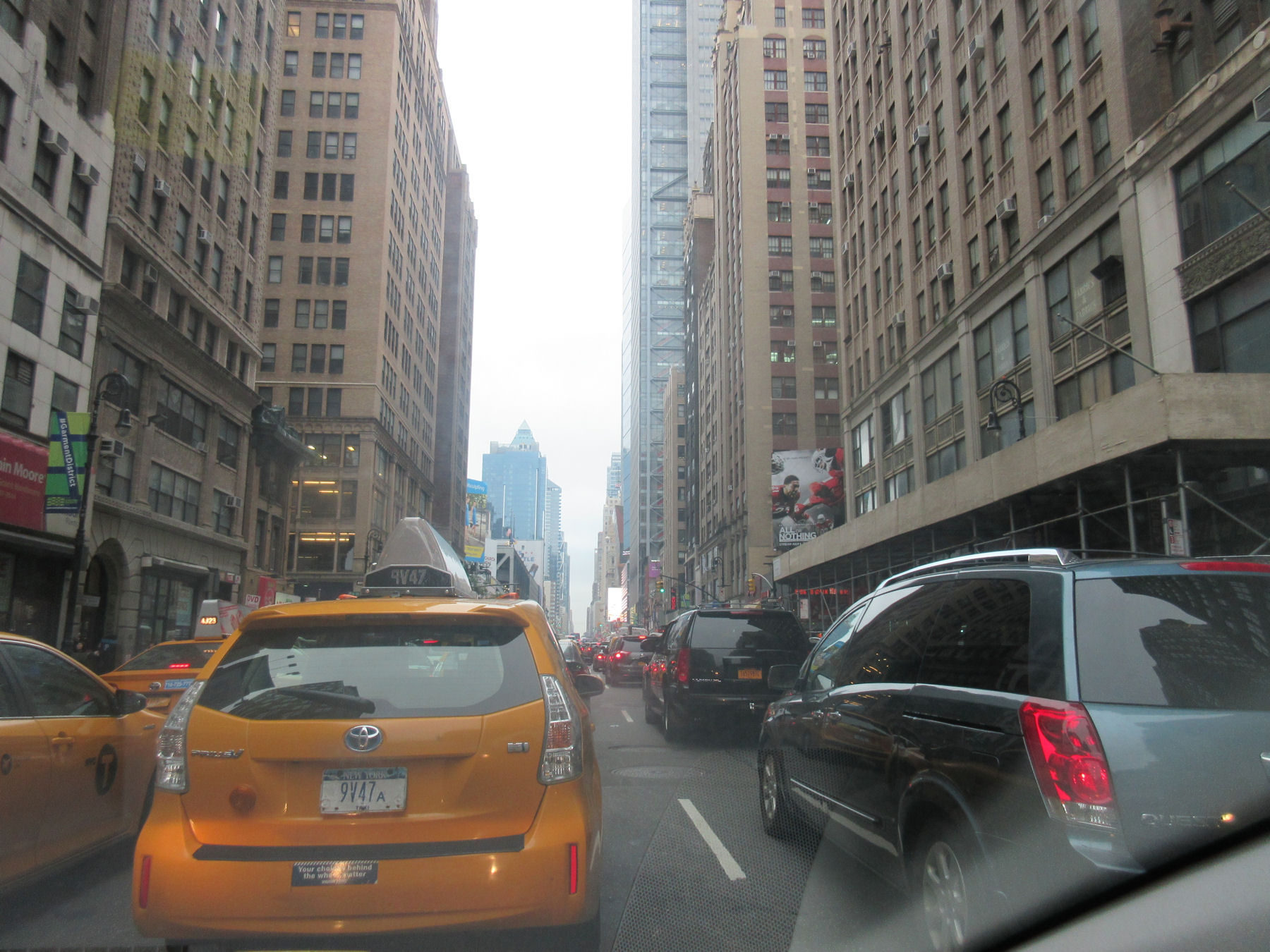 He did the best he could to minimize the drive time, barreling through every yellow light, pushing his luck and other drivers as hard as possible at every turn, switching to next streets over whenever gridlock kept us idle for too long, inching and inching and using every available bit of space to get us that much closer to our destination. I’m not 100% sure what normal Manhattan traffic patterns are like, but the areas leading up to Times Square were extra barricaded from some weekend event earlier that day, so the traffic-snarl threat levels seemed more escalated than he’d hoped.