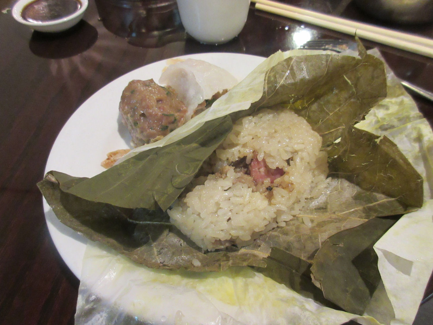 Our waitress did several drive-by offerings of additional items, such as sausage and sticky rice wrapped in grape leaves. The pork meatball on the side was from another, smaller dish.