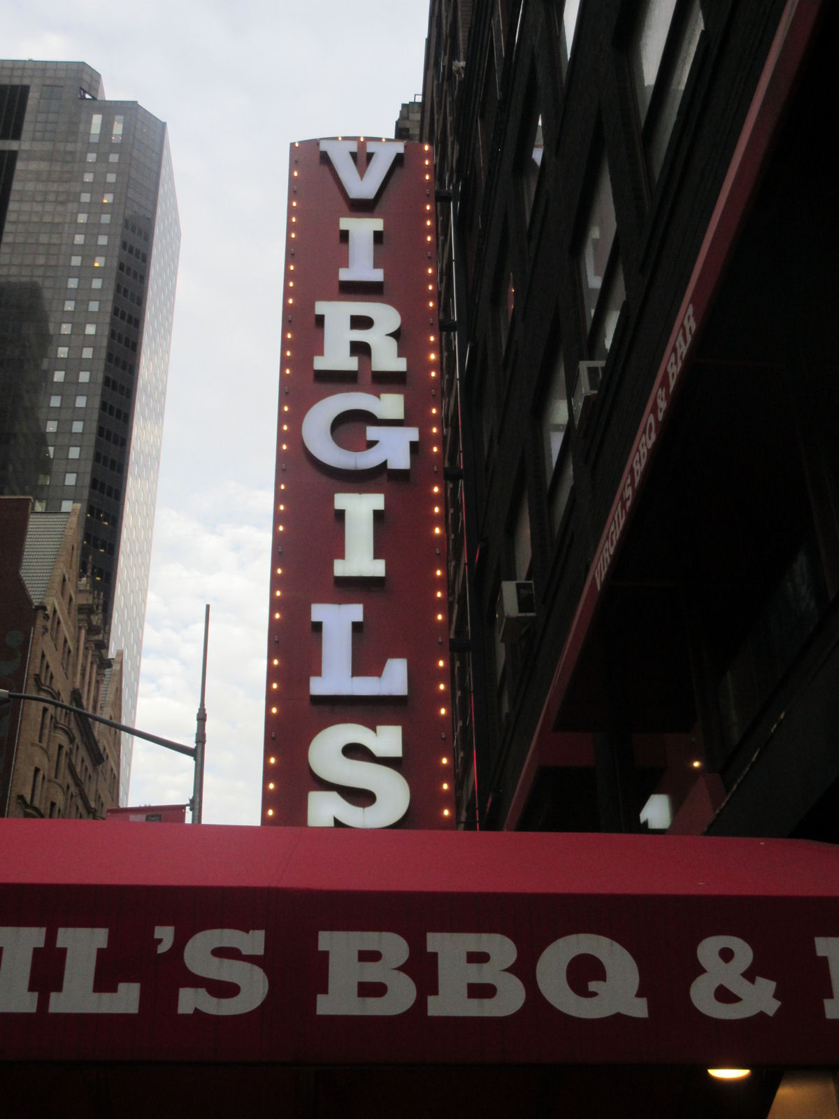 Our dinner for the evening was suggested by a coworker who once lived and produced on Broadway. “Suggested” is an understatement — the closer we got to takeoff, the more loudly he insisted every other day, “EAT AT VIRGIL’S!” Mostly we tried it so I could shut him up when I got back to the office.