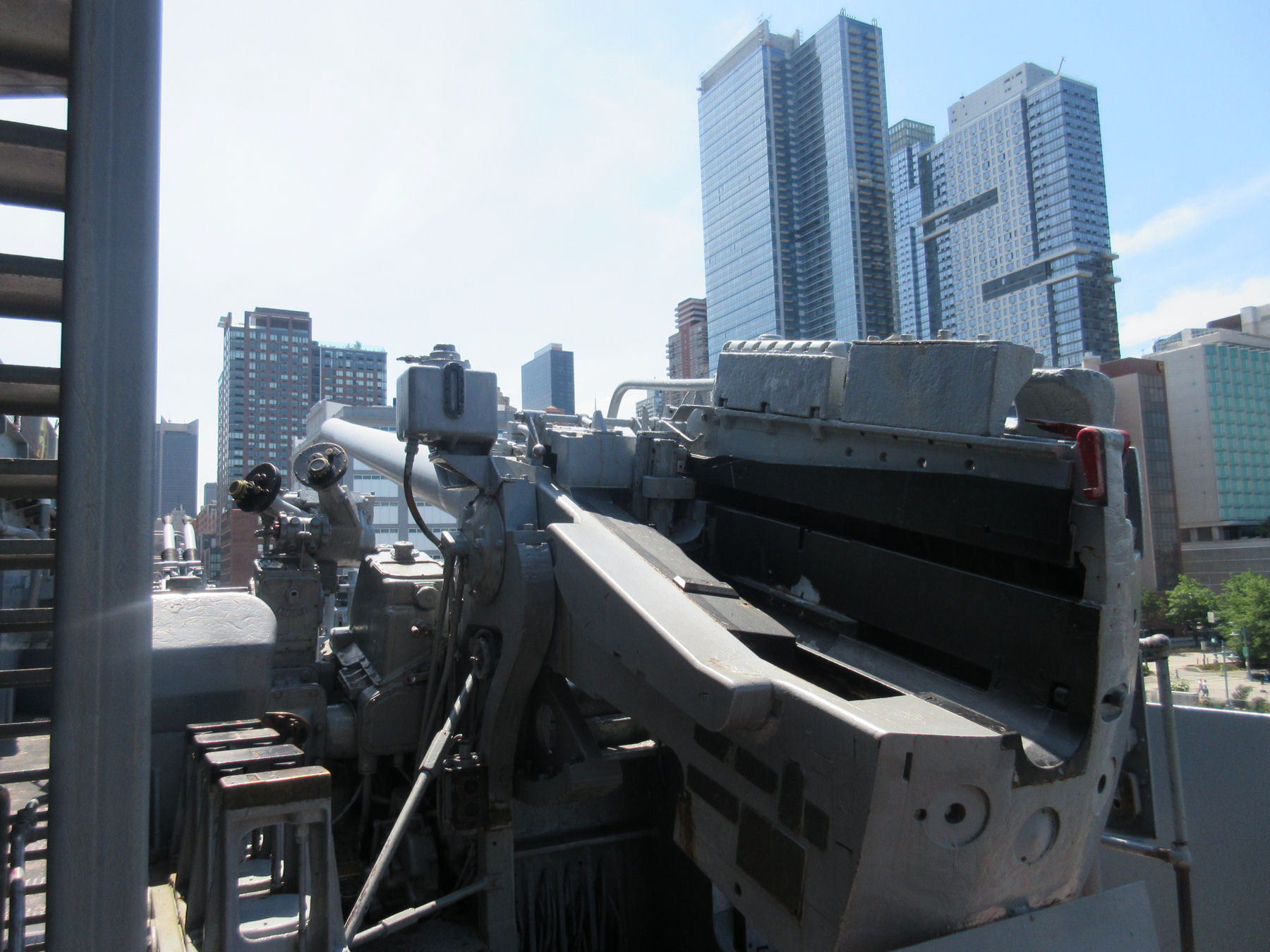 One of its 5-inch/38-caliber anti-aircraft guns, pointed at Manhattan to keep its neighbors from getting any funny ideas.
