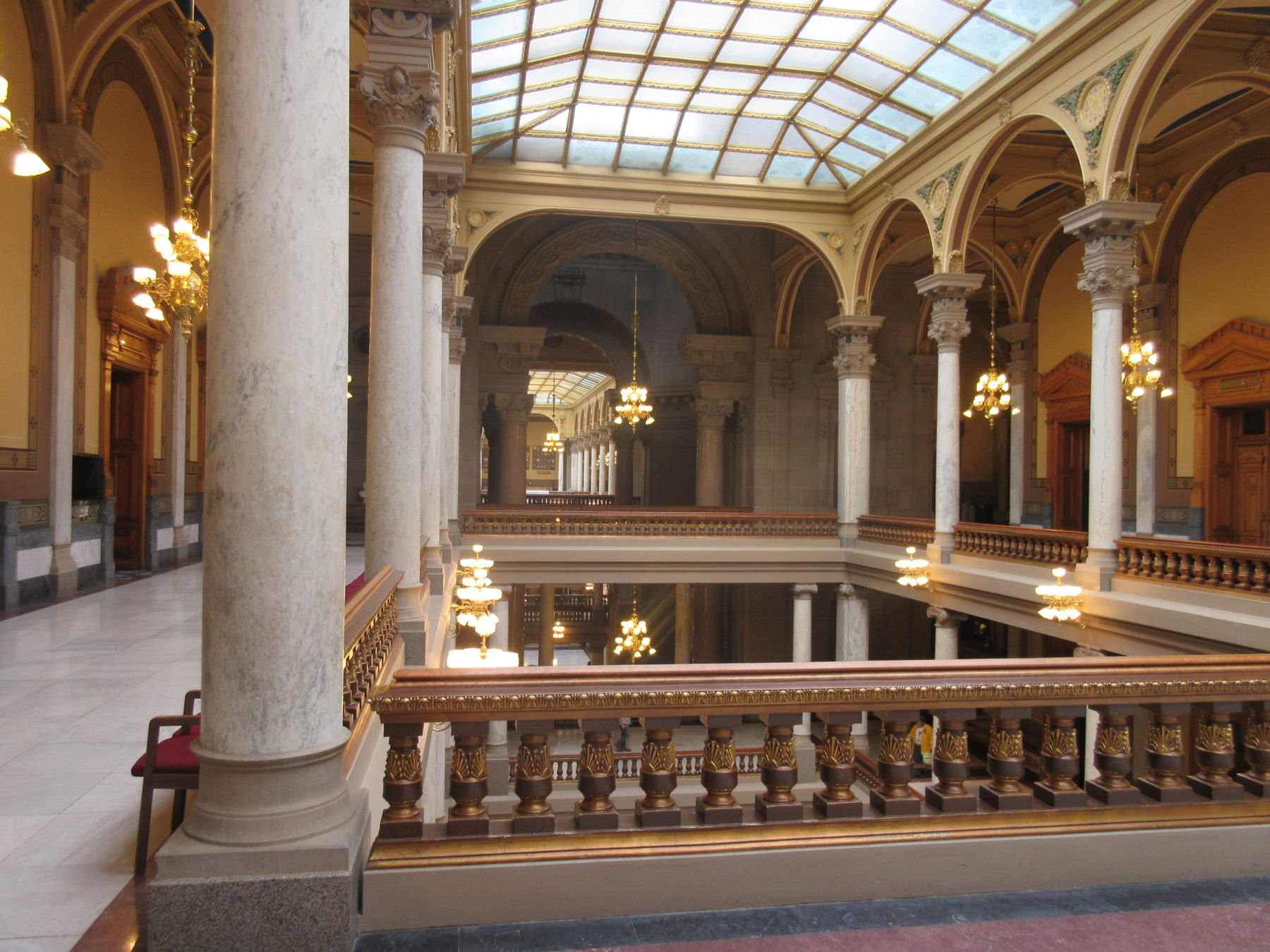 The Indiana State House isn’t far from where I work, but I never have occasion to run around it, inside or out. The inside tour was free and self-guided, and naturally subject to security screening. Its four floors contain state government offices and a variety of art fixtures celebrating Hoosier personalities, heritage, and art and architecture in general.