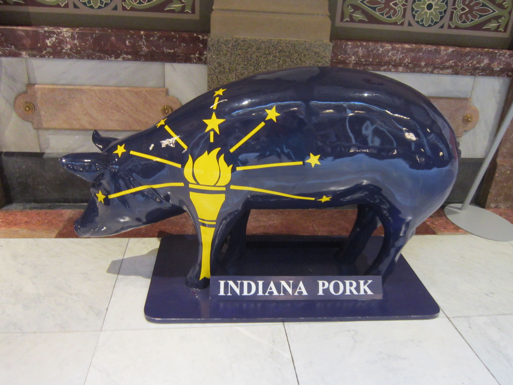 Harley the Hog (yes, really his name) stands guard outside the Lieutenant Governor’s office, a gift from Indiana Pork (yes, that’s also a thing) to former tenant Becky Skillman (2005-2013), who left it behind for subsequent Lieutenant Governors to enjoy and explain.