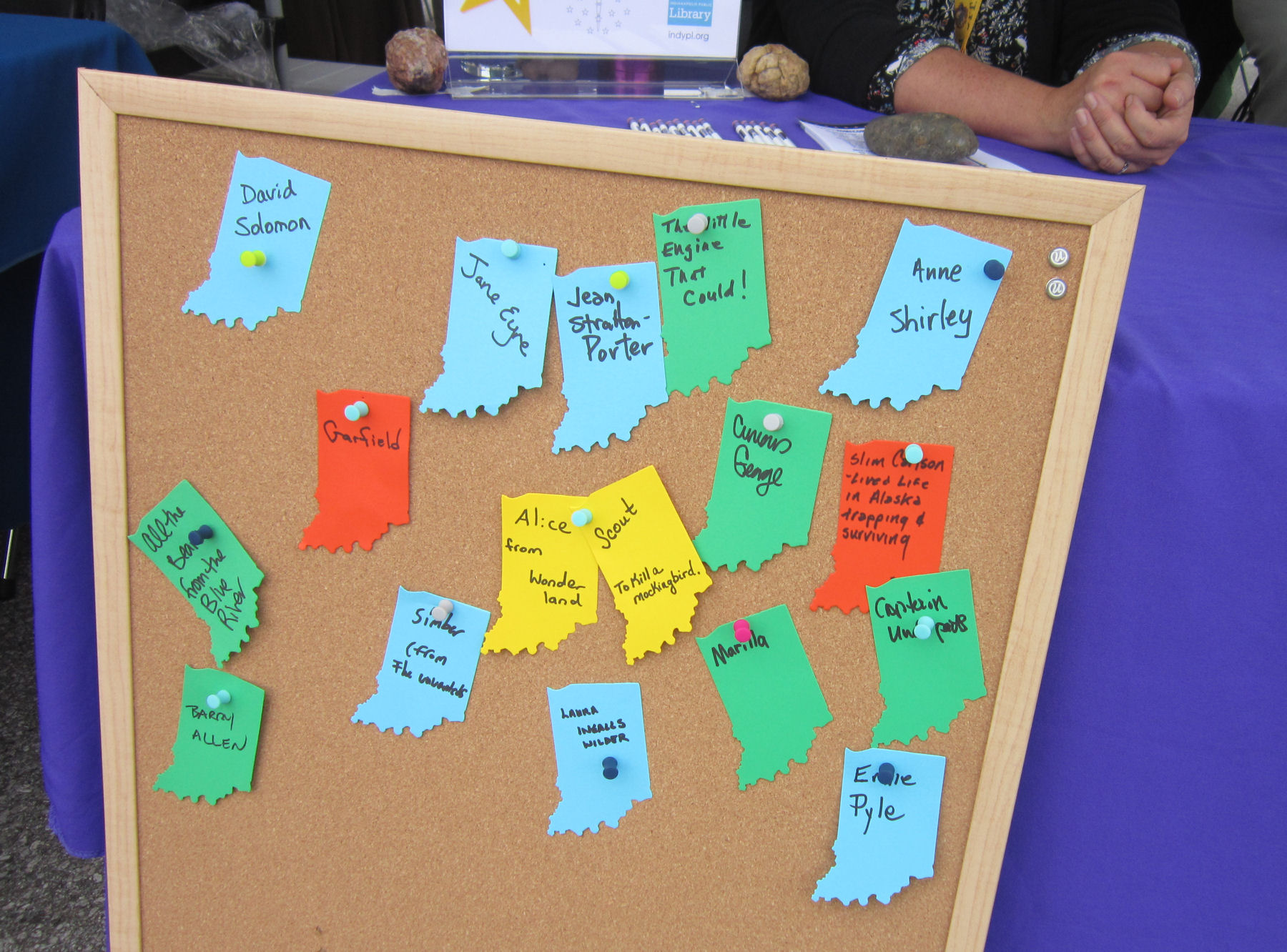Several booths provided fun activities to kids and adults that earned us a coffee-table book about Indiana farmers. This table, hosted by the Indianapolis-Marion County Public Library system, asked attendees to pin an Indiana-shaped Post-It with the name of their favorite literary character. It would take a real crime lab scientist to spot mine.
